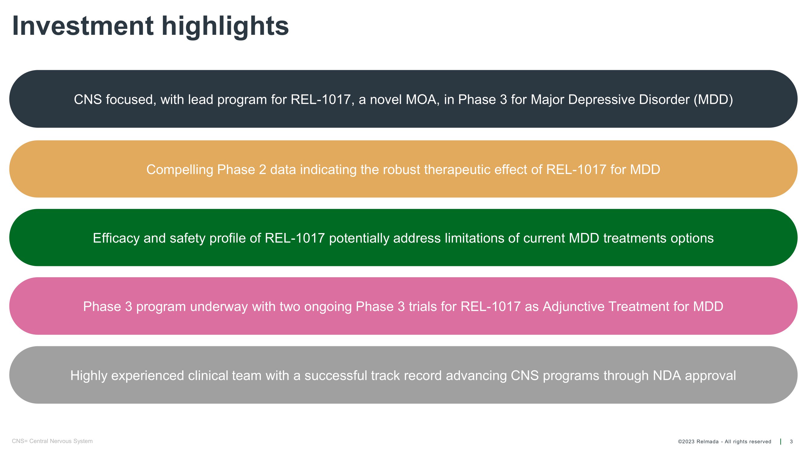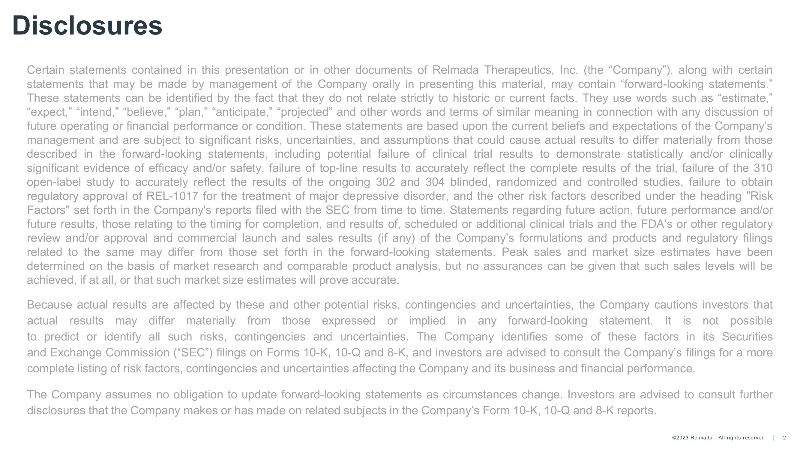 ©2023 Relmada - All rights reserved Disclosures 2 Certain statements contained in this presentation or in other documents of Relmada Therapeutics, Inc . (the “Company”), along with certain statements that may be made by management of the Company orally in presenting this material, may contain “forward - looking statements . ” These statements can be identified by the fact that they do not relate strictly to historic or current facts . They use words such as “estimate,” “expect,” “intend,” “believe,” “plan,” “anticipate,” “projected” and other words and terms of similar meaning in connection with any discussion of future operating or financial performance or condition . These statements are based upon the current beliefs and expectations of the Company’s management and are subject to significant risks, uncertainties , and assumptions that could cause actual results to differ materially from those described in the forward - looking statements, including potential failure of clinical trial results to demonstrate statistically and/or clinically significant evidence of efficacy and/or safety, failure of top - line results to accurately reflect the complete results of the trial, failure of the 310 open - label study to accurately reflect the results of the ongoing 302 and 304 blinded, randomized and controlled studies, failure to obtain regulatory approval of REL - 1017 for the treatment of major depressive disorder, and the other risk factors described under the heading "Risk Factors" set forth in the Company's reports filed with the SEC from time to time . Statements regarding future action, future performance and/or future results, those relating to the timing for completion, and results of, scheduled or additional clinical trials and the FDA’s or other regulatory review and/or approval and commercial launch and sales results (if any) of the Company’s formulations and products and regulatory filings related to the same may differ from those set forth in the forward - looking statements . Peak sales and market size estimates have been determined on the basis of market research and comparable product analysis, but no assurances can be given that such sales levels will be achieved, if at all, or that such market size estimates will prove accurate . Because actual results are affected by these and other potential risks, contingencies and uncertainties, the Company cautions investors that actual results may differ materially from those expressed or implied in any forward - looking statement . It is not possible to predict or identify all such risks, contingencies and uncertainties . The Company identifies some of these factors in its Securities and Exchange Commission (“SEC”) filings on Forms 10 - K, 10 - Q and 8 - K, and investors are advised to consult the Company’s filings for a more complete listing of risk factors, contingencies and uncertainties affecting the Company and its business and financial performance . The Company assumes no obligation to update forward - looking statements as circumstances change . Investors are advised to consult further disclosures that the Company makes or has made on related subjects in the Company’s Form 10 - K, 10 - Q and 8 - K reports .