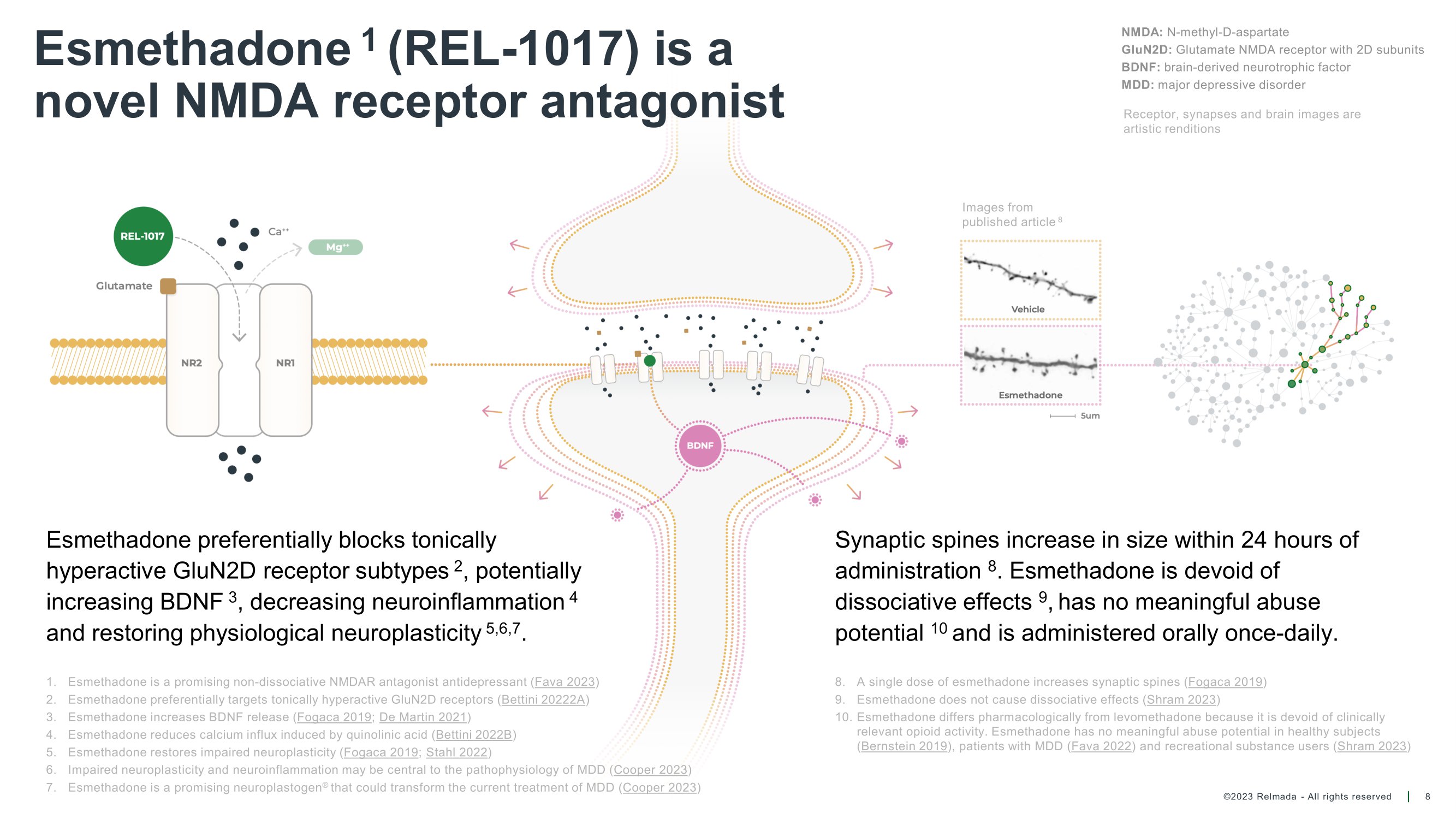 Esmethadone 1 (REL - 1017) is a novel NMDA receptor antagonist Esmethadone preferentially blocks tonically hyperactive GluN2D receptor subtypes 2 , potentially increasing BDNF 3 , decreasing neuroinflammation 4 and restoring physiological neuroplasticity 5,6,7 . NMDA: N - methyl - D - aspartate GluN2D: Glutamate NMDA receptor with 2D subunits BDNF: brain - derived neurotrophic factor MDD: major depressive disorder Synaptic spines increase in size within 24 hours of administration 8 . Esmethadone is devoid of dissociative effects 9 , has no meaningful abuse potential 10 and is administered orally once - daily. Images from published article 8 Receptor, synapses and brain images are artistic renditions 8 ©2023 Relmada - All rights reserved 8. A single dose of esmethadone increases synaptic spines ( Fogaca 2019 ) 9. Esmethadone does not cause dissociative effects ( Shram 2023 ) 10. Esmethadone differs pharmacologically from levomethadone because it is devoid of clinically relevant opioid activity. Esmethadone has no meaningful abuse potential in healthy subjects ( Bernstein 2019 ), patients with MDD ( Fava 2022 ) and recreational substance users ( Shram 2023 ) 1. Esmethadone is a promising non - dissociative NMDAR antagonist antidepressant ( Fava 2023 ) 2. Esmethadone preferentially targets tonically hyperactive GluN2D receptors ( Bettini 20222A ) 3. Esmethadone increases BDNF release ( Fogaca 2019 ; De Martin 2021 ) 4. Esmethadone reduces calcium influx induced by quinolinic acid ( Bettini 2022B ) 5. Esmethadone restores impaired neuroplasticity ( Fogaca 2019 ; Stahl 2022 ) 6. Impaired neuroplasticity and neuroinflammation may be central to the pathophysiology of MDD ( Cooper 2023 ) 7. Esmethadone is a promising neuroplastogen ® that could transform the current treatment of MDD ( Cooper 2023 )