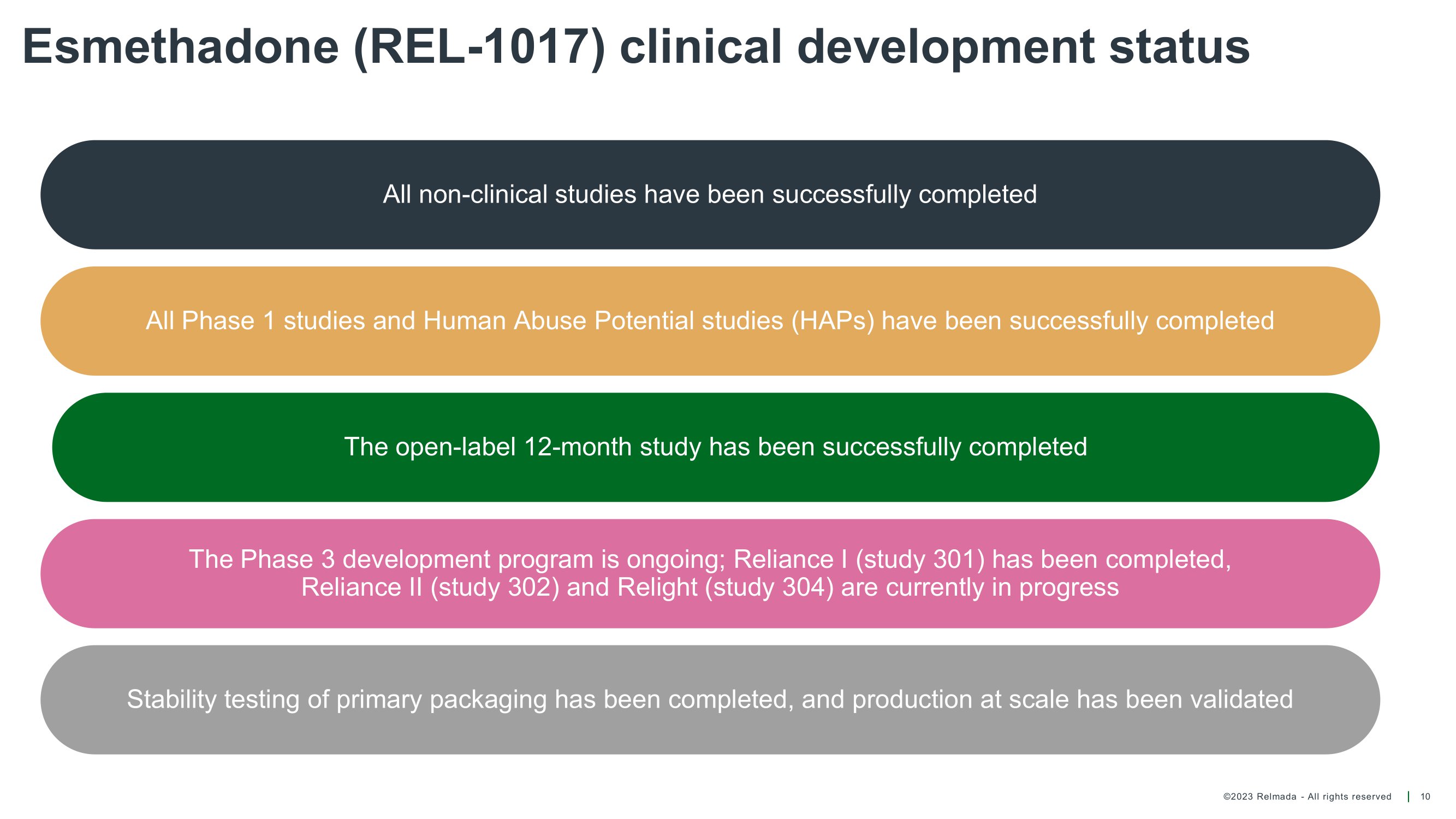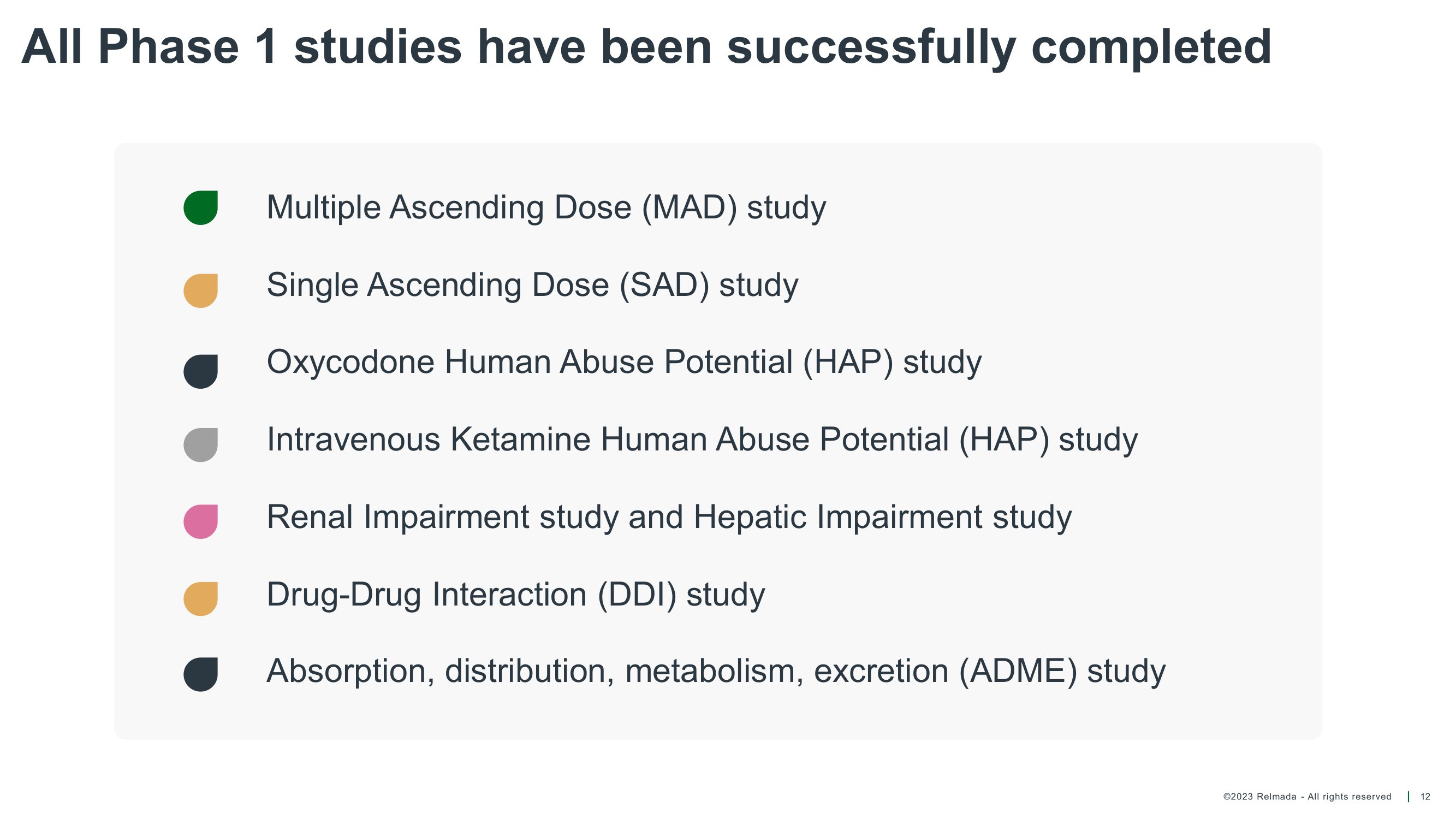 ©2023 Relmada - All rights reserved All Phase 1 studies have been successfully completed 12 Multiple Ascending Dose (MAD) study Single Ascending Dose (SAD) study Oxycodone Human Abuse Potential (HAP) study Intravenous Ketamine Human Abuse Potential (HAP) study Renal Impairment study and Hepatic Impairment study Drug - Drug Interaction (DDI) study Absorption, distribution, metabolism, excretion (ADME) study