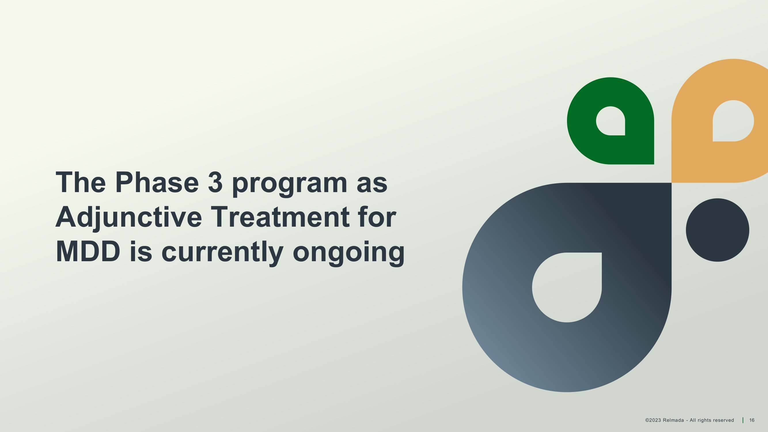©2023 Relmada - All rights reserved 16 The Phase 3 program as Adjunctive Treatment for MDD is currently ongoing