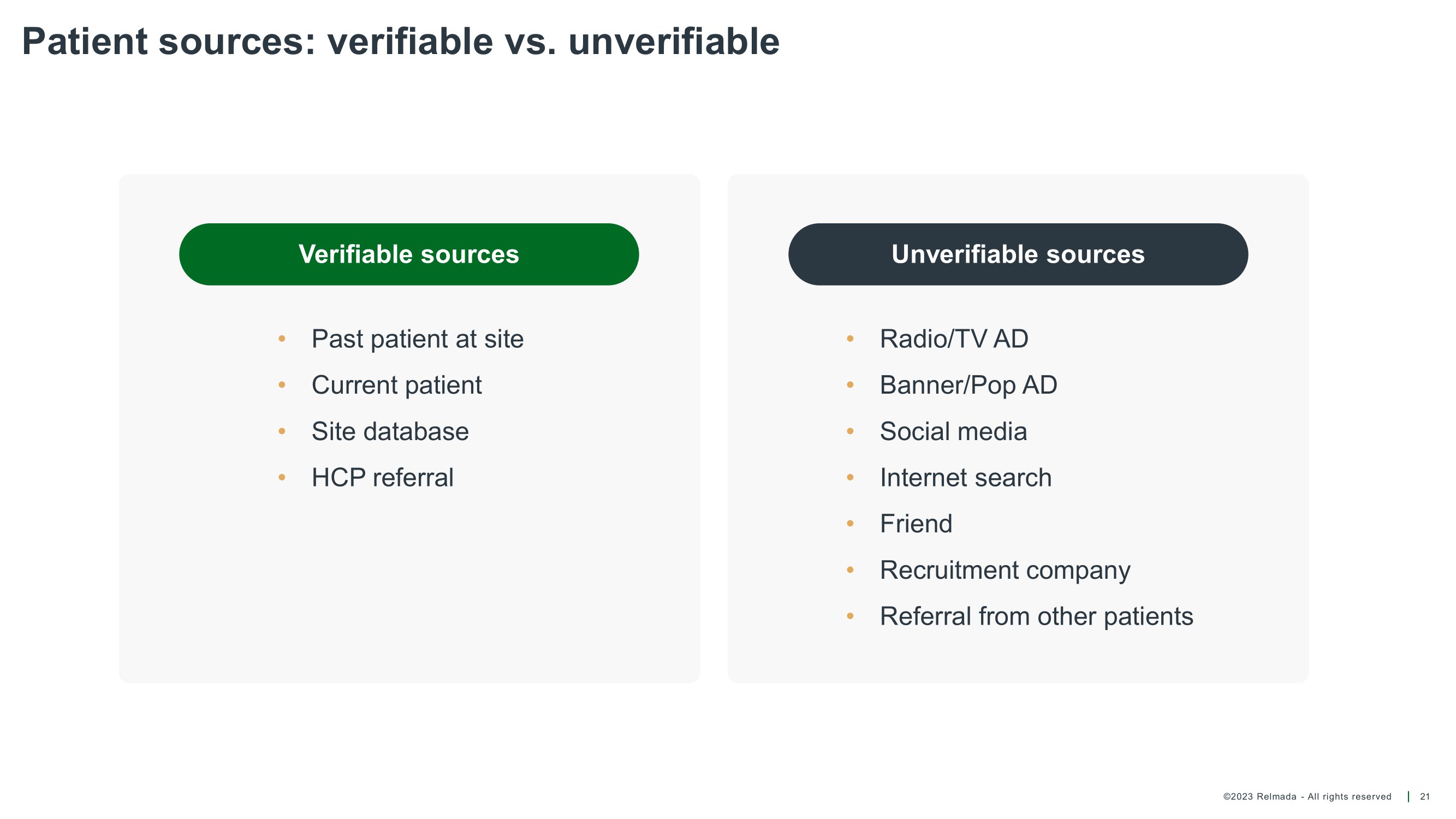©2023 Relmada - All rights reserved Patient sources: verifiable vs. unverifiable 21 Verifiable sources • Past patient at site • Current patient • Site database • HCP referral • Radio/TV AD • Banner/Pop AD • Social media • Internet search • Friend • Recruitment company • Referral from other patients Unverifiable sources