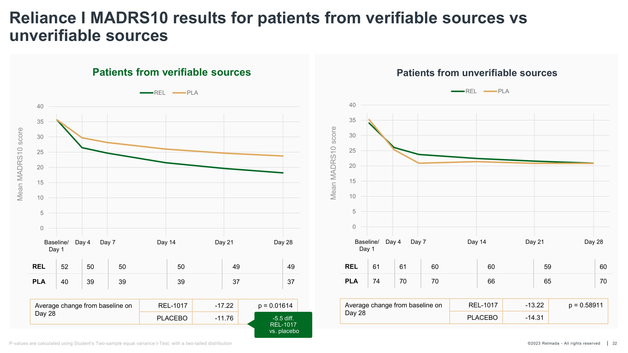 ©2023 Relmada - All rights reserved Baseline/ Day 1 Day 4 Day 7 Day 14 Day 21 Day 28 Reliance I MADRS10 results for patients from verifiable sources vs unverifiable sources 22 49 49 50 50 50 52 REL 37 37 39 39 39 40 PLA Average change from baseline on Day 28 REL - 1017 - 17.22 PLACEBO - 11.76 p = 0.58911 - 13.22 REL - 1017 Average change from baseline on Day 28 - 14.31 PLACEBO Mean MADRS10 score Mean MADRS10 score Baseline/ Day 4 Day 1 Day 7 Day 14 Day 21 Day 28 60 59 60 60 61 61 REL 70 65 66 70 70 74 PLA P - values are calculated using Student's Two - sample equal variance t - Test, with a two - tailed distribution 0 5 10 15 20 25 30 35 40 Patients from verifiable sources REL PLA p = 0.01614 - 5.5 diff. REL - 1017 vs. placebo 0 5 10 15 20 25 30 35 40 Patients from unverifiable sources REL PLA