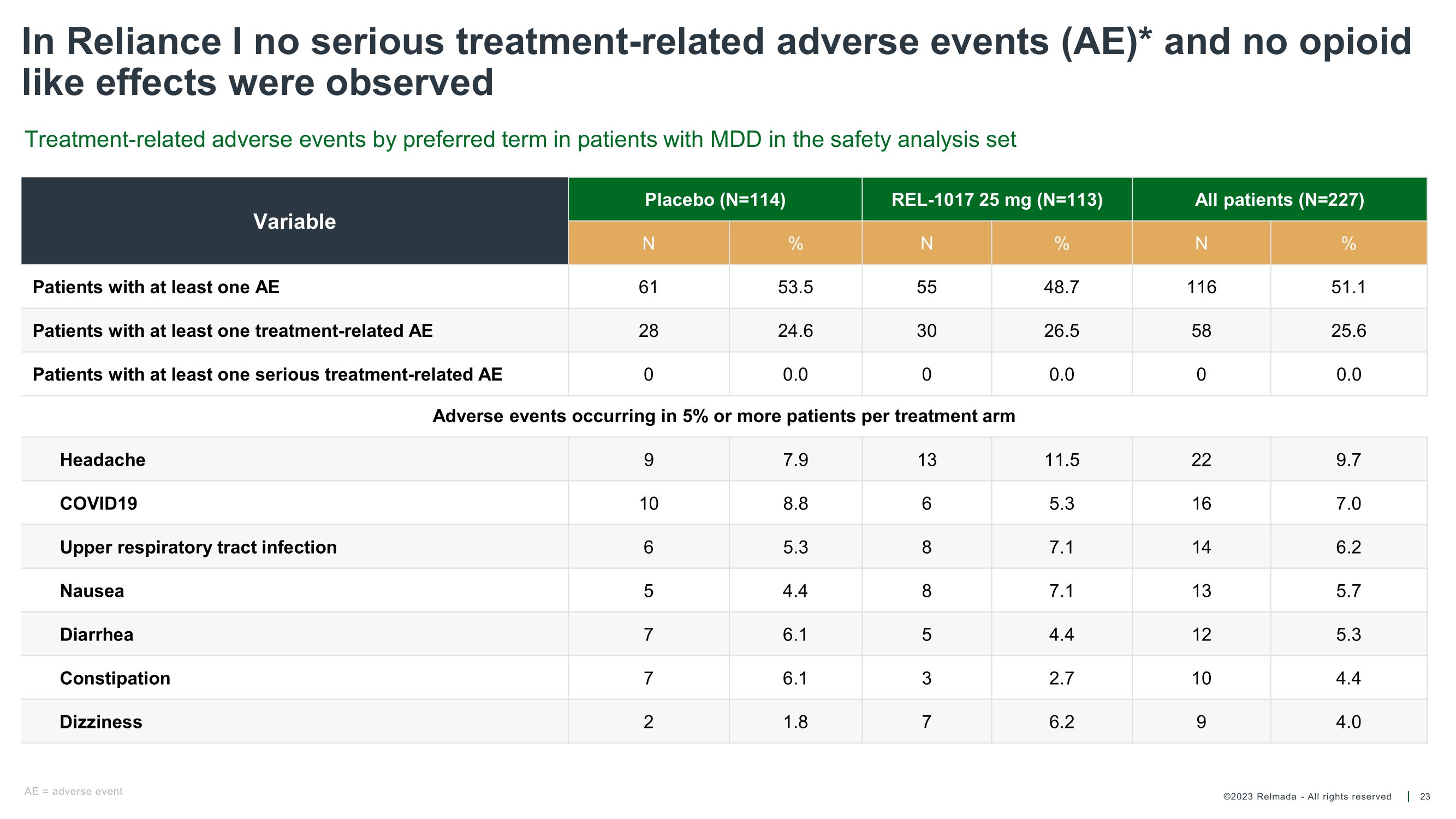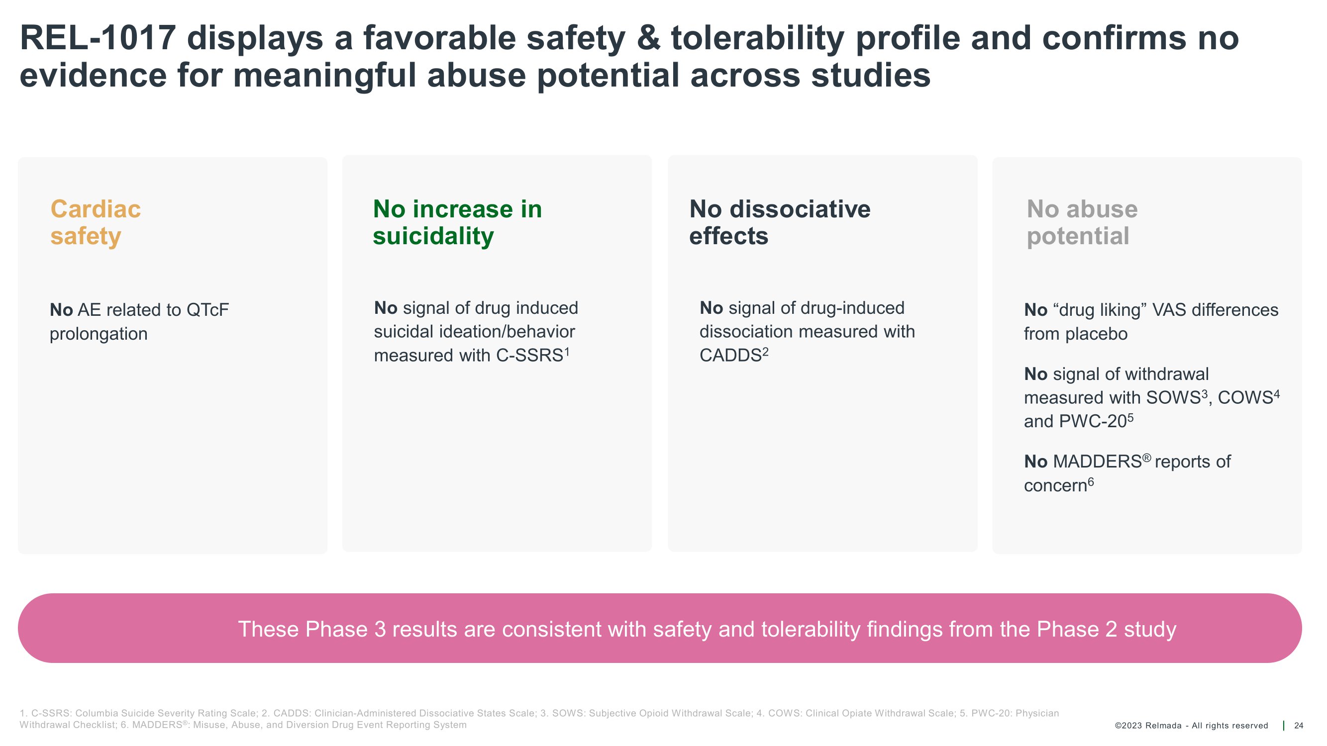 ©2023 Relmada - All rights reserved In Reliance I no serious treatment - related adverse events (AE)* and no opioid like effects were observed 23 All patients (N=227) REL - 1017 25 mg (N=113) Placebo (N=114) Variable % N % N % N 51.1 116 48.7 55 53.5 61 Patients with at least one AE 25.6 58 26.5 30 24.6 28 Patients with at least one treatment - related AE 0.0 0 0.0 0 0.0 0 Patients with at least one serious treatment - related AE 9.7 22 11.5 13 7.9 9 Headache 7.0 16 5.3 6 8.8 10 COVID19 6.2 14 7.1 8 5.3 6 Upper respiratory tract infection 5.7 13 7.1 8 4.4 5 Nausea 5.3 12 4.4 5 6.1 7 Diarrhea 4.4 10 2.7 3 6.1 7 Constipation 4.0 9 6.2 7 1.8 2 Dizziness Adverse events occurring in 5% or more patients per treatment arm Treatment - related adverse events by preferred term in patients with MDD in the safety analysis set AE = adverse event