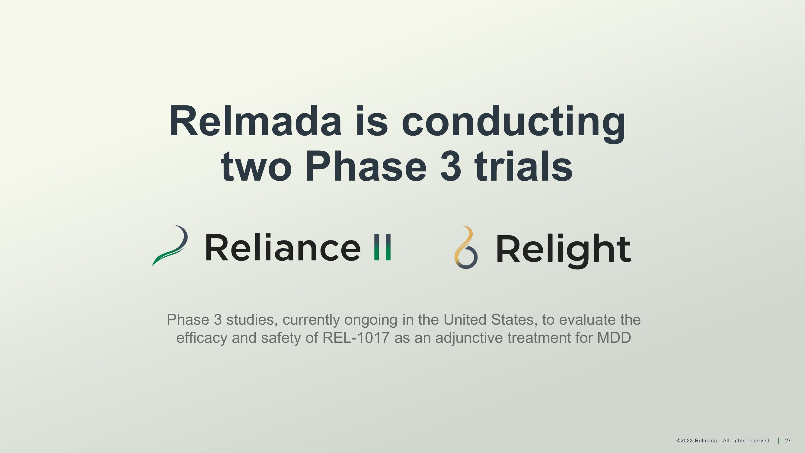 ©2023 Relmada - All rights reserved 27 Relmada is conducting two Phase 3 trials Phase 3 studies, currently ongoing in the United States, to evaluate the efficacy and safety of REL - 1017 as an adjunctive treatment for MDD