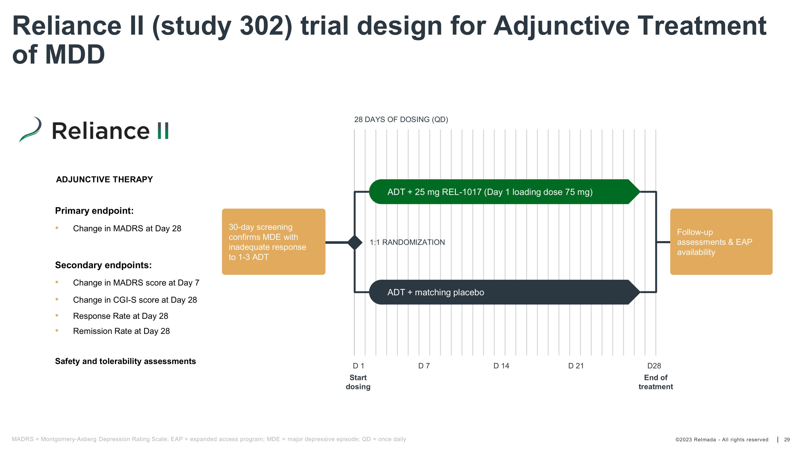 ©2023 Relmada - All rights reserved Relight (study 304) trial design for Adjunctive Treatment of MDD 30 Follow - up assessments & EAP availability ADT + matching placebo ADT + 25 mg REL - 1017 (Day 1 loading dose 75 mg) 1:1 RANDOMIZATION 28 DAYS OF DOSING (QD) MADRS = Montgomery - Asberg Depression Rating Scale; MDE = major depressive episode; ADT = antidepressant treatment; QD = once daily; EAP = expanded access program Primary endpoint: • Change in MADRS at Day 28 Secondary endpoints: • Change in MADRS score at Day 7 • Change in CGI - S score at Day 28 • Response Rate at Day 28 • Remission Rate at Day 28 Safety and tolerability assessments 30 - day screening confirms MDE with inadequate response to 1 - 3 ADT ADJUNCTIVE THERAPY D 1 Start dosing D 7 D 14 D28 End of treatment D 21
