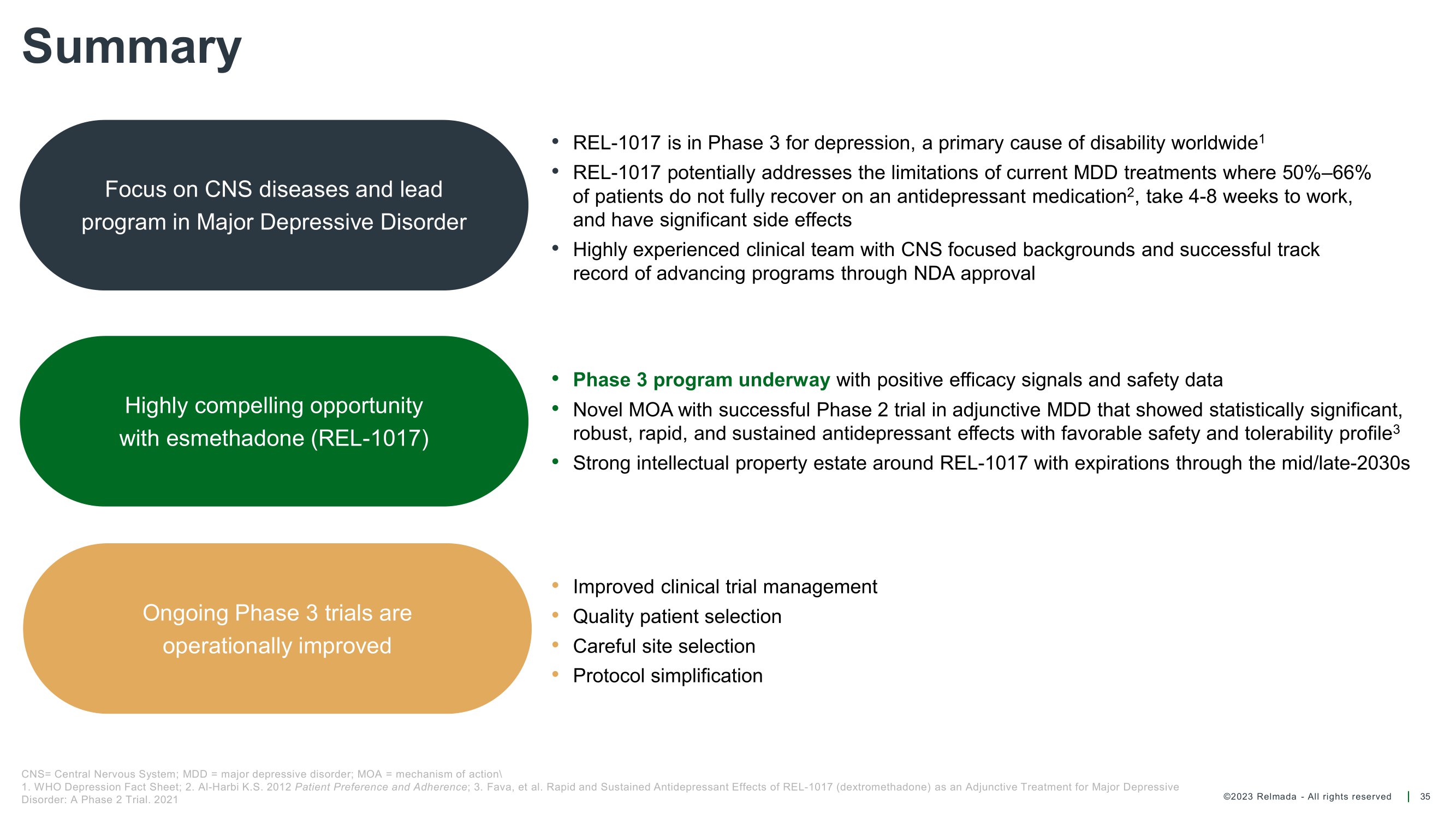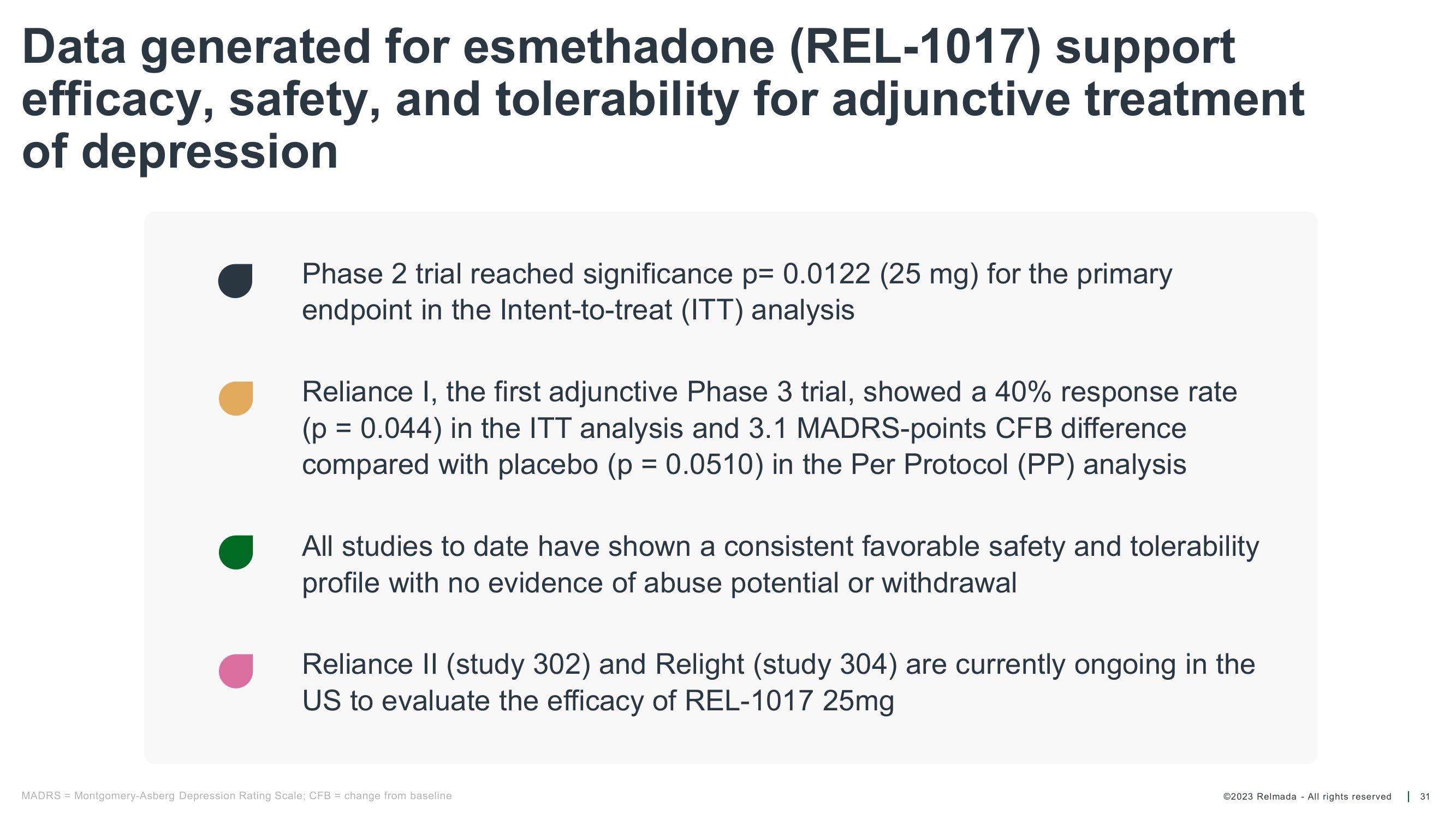 ©2023 Relmada - All rights reserved Unique profile of esmethadone (REL - 1017) addresses limitations of current treatments Potential as a rapid, oral, once - daily antidepressant for MDD, if approved 7 MDD = major depressive disorder; NMDAR = N - methyl - D - aspartate receptor 1. Bettini E al. Pharmacological Comparative Characterization of REL - 1017 (Esmethadone - HCl) and Other NMDAR Channel Blockers in Human Heterodimeric N - Methyl - D - Aspartate Receptors. Pharmaceuticals (Basel). 2022;15(8):997; 2. Bettini E et al. The N - Methyl - D - Aspartate Receptor Blocker REL - 1017 (Esmethadone) Reduces Calcium Influx Induced by Glutamate, Quinolinic Acid, and Gentamicin. Pharmaceuticals (Basel). 2022;15(7):882; 3. Stahl SM et al. Esmethadone (REL - 1017) and Other Uncompetitive NMDAR Channel Blockers May Improve Mood Disorders via Modulation of Synaptic Kinase - Mediated Signaling. Int J Mol Sci. 2022;23(20); 4. Fava M et al. REL - 1017 (Esmethadone) as Adjunctive Treatment in Patients With Major Depressive Disorder: A Phase 2a Randomized Double - Blind Trial. Am J Psychiatry. 2022;179(2):122 - 131; 5. Bernstein et al. Characterization of the Safety and Pharmacokinetic Profile of D - Methadone, a Novel N - Methyl - D - Aspartate Receptor Antagonist in Healthy, Opioid - Naive Subjects: Results of Two Phase 1 Studies. J Clin Psychopharmacol. 2019;39(3):226 - 237; 6. Relmada data on file Clinical data has demonstrated: • Robust, rapid, and sustained statistically significant antidepressant effects on all tested scales 4 • Rapid onset: significant efficacy effects by Day 4 4 • Favorable safety and tolerability profile consistent across all studies 4,5,6 : no opioid and no psychotomimetic adverse events and no metabolic side effects 4,5,6 • Orally administered, once - daily tablet Novel Mechanism of Action: preferential targeting of NMDAR channels potentially associated with MDD 1,2,3