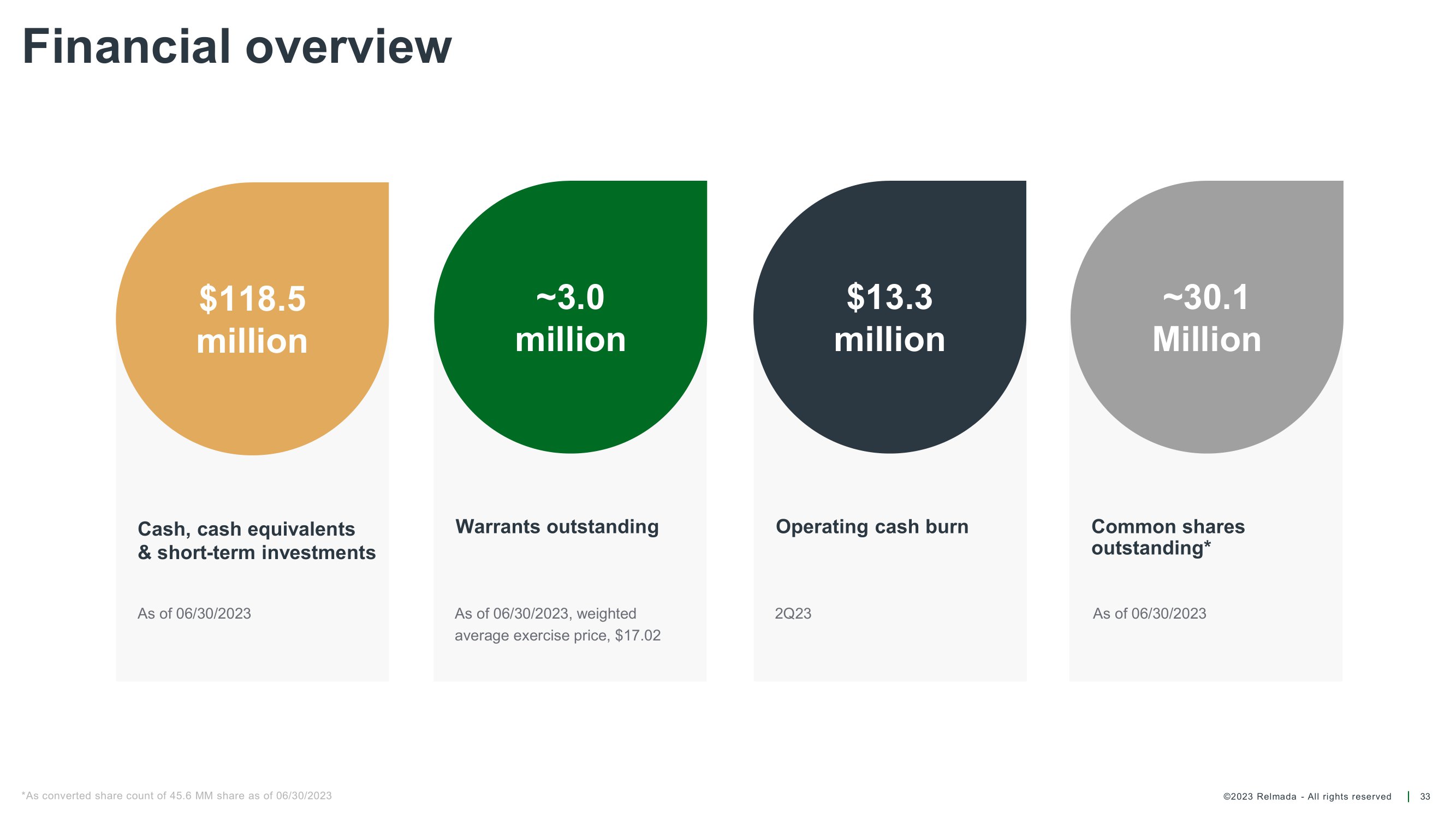 ©2023 Relmada - All rights reserved Warrants outstanding Operating cash burn Common shares outstanding* Financial overview 33 Cash, cash equivalents & short - term investments $118.5 million ~3.0 million $13.3 million ~30.1 Million As of 06/30/2023, weighted average exercise price, $17.02 2Q23 As of 06/30/2023 As of 06/30/2023 *As converted share count of 45.6 MM share as of 06/30/2023