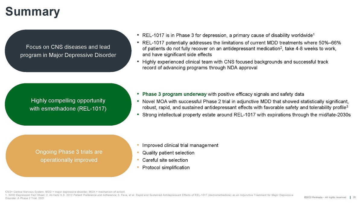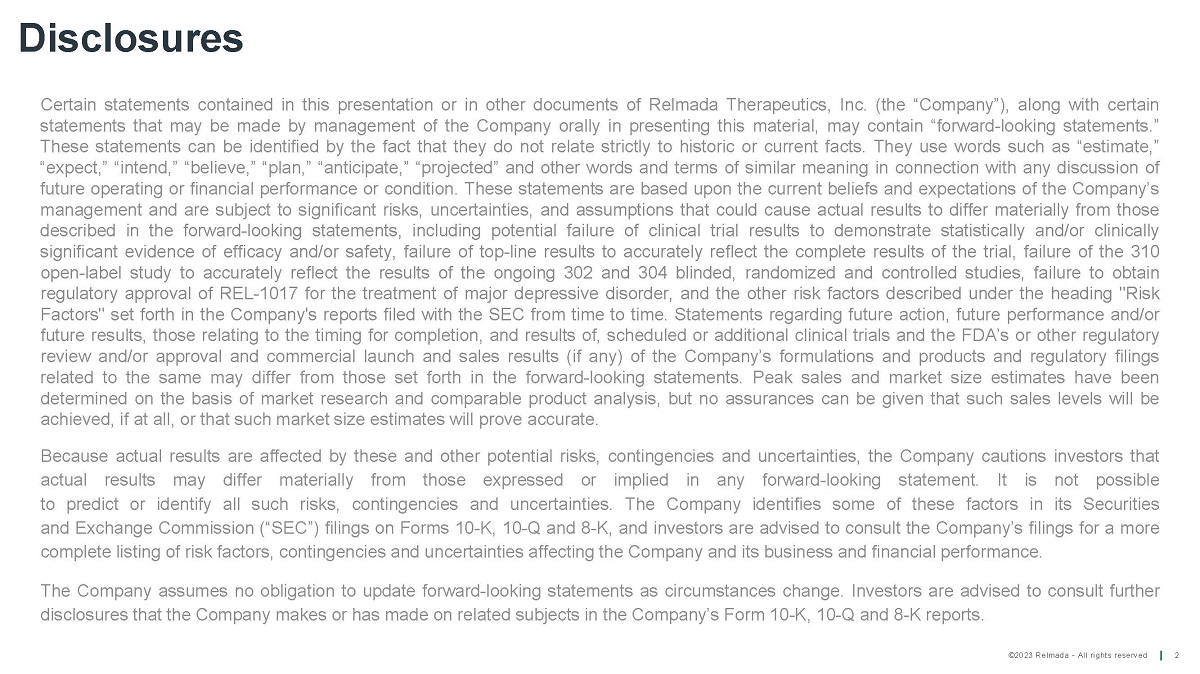 ©2023 Relmada - All rights reserved D i sc lo s u r es 2 Certain statements contained in this presentation or in other documents of Relmada Therapeutics, Inc . (the “Company”), along with certain statements that may be made by management of the Company orally in presenting this material, may contain “forward - looking statements . ” These statements can be identified by the fact that they do not relate strictly to historic or current facts . They use words such as “estimate,” “expect,” “intend,” “believe,” “plan,” “anticipate,” “projected” and other words and terms of similar meaning in connection with any discussion of future operating or financial performance or condition . These statements are based upon the current beliefs and expectations of the Company’s management and are subject to significant risks, uncertainties , and assumptions that could cause actual results to differ materially from those described in the forward - looking statements, including potential failure of clinical trial results to demonstrate statistically and/or clinically significant evidence of efficacy and/or safety, failure of top - line results to accurately reflect the complete results of the trial, failure of the 310 open - label study to accurately reflect the results of the ongoing 302 and 304 blinded, randomized and controlled studies, failure to obtain regulatory approval of REL - 1017 for the treatment of major depressive disorder, and the other risk factors described under the heading "Risk Factors" set forth in the Company's reports filed with the SEC from time to time . Statements regarding future action, future performance and/or future results, those relating to the timing for completion, and results of, scheduled or additional clinical trials and the FDA’s or other regulatory review and/or approval and commercial launch and sales results (if any) of the Company’s formulations and products and regulatory filings related to the same may differ from those set forth in the forward - looking statements . Peak sales and market size estimates have been determined on the basis of market research and comparable product analysis, but no assurances can be given that such sales levels will be achieved, if at all, or that such market size estimates will prove accurate . Because actual results are affected by these and other potential risks, contingencies and uncertainties, the Company cautions investors that actual results may differ materially from those expressed or implied in any forward - looking statement . It is not possible to predict or identify all such risks, contingencies and uncertainties . The Company identifies some of these factors in its Securities and Exchange Commission (“SEC”) filings on Forms 10 - K, 10 - Q and 8 - K, and investors are advised to consult the Company’s filings for a more complete listing of risk factors, contingencies and uncertainties affecting the Company and its business and financial performance . The Company assumes no obligation to update forward - looking statements as circumstances change . Investors are advised to consult further disclosures that the Company makes or has made on related subjects in the Company’s Form 10 - K, 10 - Q and 8 - K reports .