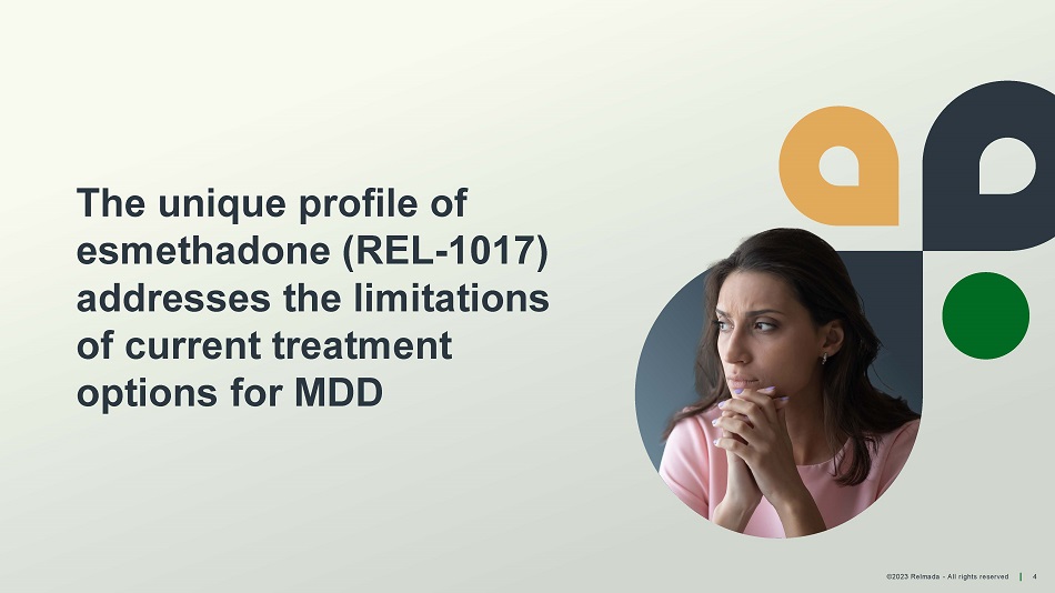 ©2023 Relmada - All rights reserved Highly experienced clinical team with a successful track record advancing CNS programs through NDA approval Phase 3 program underway with two ongoing Phase 3 trials for REL - 1017 as Adjunctive Treatment for MDD Efficacy and safety profile of REL - 1017 potentially address limitations of current MDD treatments options Compelling Phase 2 data indicating the robust therapeutic effect of REL - 1017 for MDD Investment highlights 3 CNS= Central Nervous System CNS focused, with lead program for REL - 1017, a novel MOA, in Phase 3 for Major Depressive Disorder (MDD)