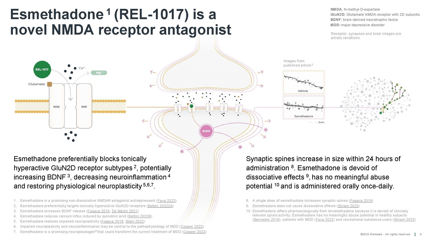 E s m e t h a don e 1 (RE L - 1017 ) i s a novel NMDA receptor antagonist Esmethadone preferentially blocks tonically hyperactive GluN2D receptor subtypes 2 , potentially in c rea s ing BDN F 3 , de c rea s ing neuroinfla mm ation 4 and restoring physiological neuroplasticity 5,6,7 . NMDA: N - methyl - D - aspartate GluN2D: Glutamate NMDA receptor with 2D subunits BDNF: brain - derived neurotrophic factor MDD: major depressive disorder Synaptic spines increase in size within 24 hours of administration 8 . Esmethadone is devoid of dissociative effects 9 , has no meaningful abuse potential 10 and is administered orally once - daily. Images from pub li s he d ar ti c l e 8 Receptor, synapses and brain images are artistic renditions 8 ©2023 Relmada - All rights reserved 8. A single dose of esmethadone increases synaptic spines ( Fogaca 2019 ) 9. Esmethadone does not cause dissociative effects ( Shram 2023 ) 10. Esmethadone differs pharmacologically from levomethadone because it is devoid of clinically relevant opioid activity. Esmethadone has no meaningful abuse potential in healthy subjects ( Bernstein 2019 ), patients with MDD ( Fava 2022 ) and recreational substance users ( Shram 2023 ) 1. Esmethadone is a promising non - dissociative NMDAR antagonist antidepressant ( Fava 2023 ) 2. Esmethadone preferentially targets tonically hyperactive GluN2D receptors ( Bettini 20222A ) 3. Esmethadone increases BDNF release ( Fogaca 2019 ; De Martin 2021 ) 4. Esmethadone reduces calcium influx induced by quinolinic acid ( Bettini 2022B ) 5. Esmethadone restores impaired neuroplasticity ( Fogaca 2019 ; Stahl 2022 ) 6. Impaired neuroplasticity and neuroinflammation may be central to the pathophysiology of MDD ( Cooper 2023 ) 7. Esmethadone is a promising neuroplastogen ® that could transform the current treatment of MDD ( Cooper 2023 )