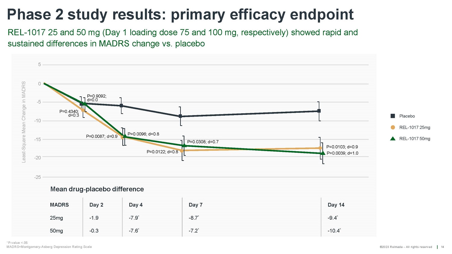 ©2023 Relmada - All rights reserved B a s eline/ Day 1 D ay 4 D ay 7 D ay 14 D ay 21 D ay 28 Reliance I MADRS10 results for patients from verifiable sources vs unverifiable sources 22 49 49 50 50 50 52 REL 37 37 39 39 39 40 PLA Average change from baseline on Day 28 REL - 1017 - 17.22 PLACEBO - 11.76 p = 0.58911 - 13.22 REL - 1017 Average change from baseline on Day 28 - 14.31 PLACEBO Mean MADRS10 score Mean MADRS10 score Baseline/ Day 4 Day 1 D ay 7 D ay 14 D ay 21 D ay 28 60 59 60 60 61 61 REL 70 65 66 70 70 74 PLA P - values are calculated using Student's Two - sample equal variance t - Test, with a two - tailed distribution 0 5 10 15 20 25 30 35 40 Patients from verifiable sources REL PLA p = 0.01614 - 5.5 diff. REL - 1017 v s . pla c ebo 0 5 10 15 20 25 30 35 40 Patients from unverifiable sources REL PLA