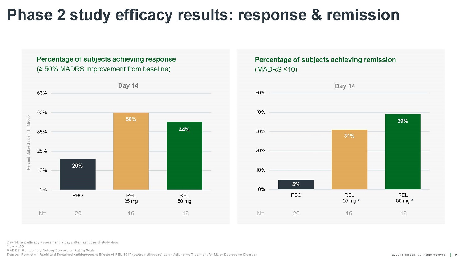 ©2023 Relmada - All rights reserved Phase 2 study efficacy results: response & remission 15 20% 50% 44% 0% 1 3 % 2 5 % 3 8 % 5 0 % P BO REL 25 mg REL 50 mg Percent Subjects per ITT Group Percentage of subjects achieving response (≥ 50% MADRS improvement from baseline) Day 14 63% N = 20 16 18 5% 31% 39% 0% 1 0 % 2 0 % 3 0 % 4 0 % P BO Percentage of subjects achieving remission (MADRS ≤10) Day 14 50% N= 20 REL 2 5 m g * 16 REL 50 mg * 18 Day 14: last efficacy assessment, 7 days after last dose of study drug * p = < .05 MADRS=Montgomery - Asberg Depression Rating Scale Source: Fava et al. Rapid and Sustained Antidepressant Effects of REL - 1017 (dextromethadone) as an Adjunctive Treatment for Major Depressive Disorder
