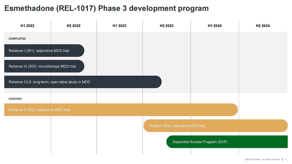 ©2023 Relmada - All rights reserved 16 The Phase 3 program as Adjunctive Treatment for MDD is currently ongoing