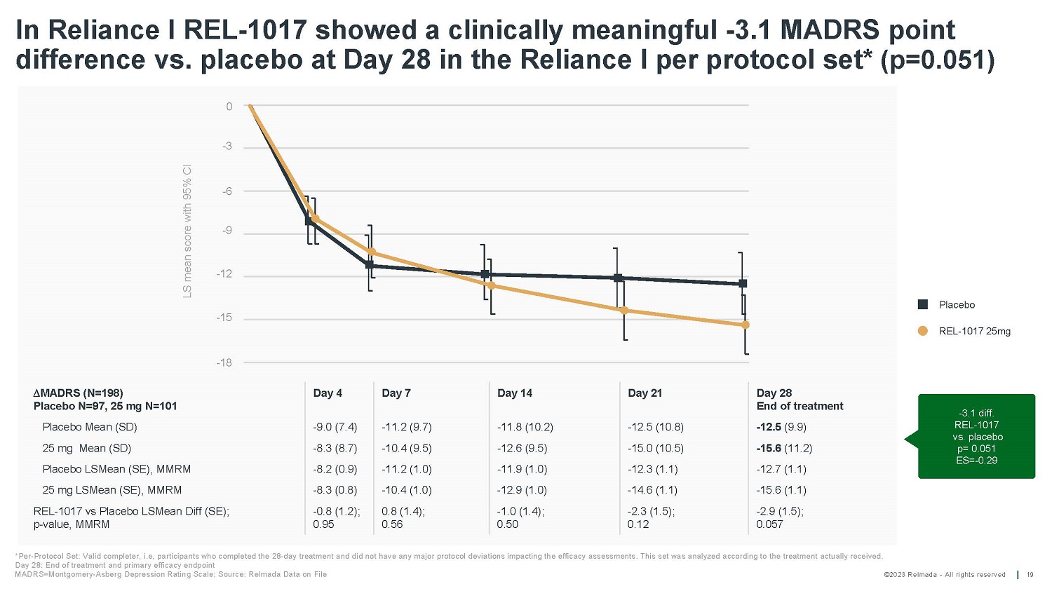 ©2023 Relmada - All rights reserved LS mean change from baseline in MADRS10 total score (+/ - 95% CI) 0 - 5 - 10 - 15 Reliance I primary efficacy endpoint: REL - 1017 showed a clinically meaningful - 2.3 MADRS point difference vs. placebo at Day 28 in the full analysis set 18 Day 28: last efficacy assessment Total N=227 ; MADRS=Montgomery - Asberg Depression Rating Scale; Source: Relmada Data on File Day 28 End of treatment Day 21 Day 14 Day 7 Day 4 MADRS (N=227) Placebo N=114, 25 mg N=113, 43 sites - 12.9 (10.4) - 13.0 (11.2) - 12.2 (10.9) - 11.8 (9.9) - 9.3 (7.3) Placebo Mean (SD) - 15.1 (11.3) - 14.4 (10.4) - 12.4 (9.4) - 10.2 (9.5) - 8.3 (8.9) 25 mg Mean (SD) - 13.4 (1.1) - 13.0 (1.0) - 12.4 (1.0) - 11.9 (0.9) - 8.5 (0.8) Placebo LSMean (SE), MMRM - 15.1 (1.1) - 14.2 (1.0) - 12.6 (1.0) - 10.2 (0.9) - 8.3 (0.8) 25 mg LSMean (SE), MMRM - 1.7 (1.5); 0.26 - 1.2 (1.5); 0.42 - 0.2 (1.4); 0.88 1.7 (1.3); 0.20 0.2 (1.2); 0.85 REL - 1017 vs Placebo LSMean Diff (SE); p - value, MMRM P la c ebo RE L - 1017 25 m g - 2.3 diff. RE L - 1017 v s . pla c ebo p=0.15 ES= - 0.21