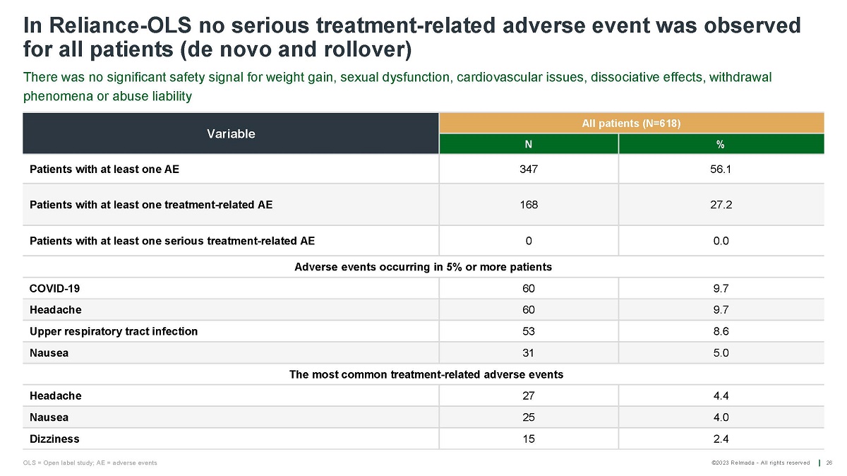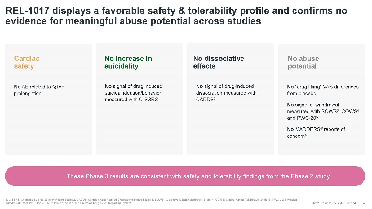 ©2023 Relmada - All rights reserved In Reliance I no serious treatment - related adverse events (AE)* and no opioid like effects were observed 23 All patients (N=227) REL - 1017 25 mg (N=113) Placebo (N=114) Variable % N % N % N 51.1 116 48.7 55 53.5 61 Patients with at least one AE 25.6 58 26.5 30 24.6 28 Patients with at least one treatment - related AE 0.0 0 0.0 0 0.0 0 Patients with at least one serious treatment - related AE 9.7 22 11.5 13 7.9 9 Headache 7.0 16 5.3 6 8.8 10 COVID19 6.2 14 7.1 8 5.3 6 Upper respiratory tract infection 5.7 13 7.1 8 4.4 5 Nausea 5.3 12 4.4 5 6.1 7 Diarrhea 4.4 10 2.7 3 6.1 7 Constipation 4.0 9 6.2 7 1.8 2 Dizziness Adverse events occurring in 5% or more patients per treatment arm Treatment - related adverse events by preferred term in patients with MDD in the safety analysis set AE = adverse event