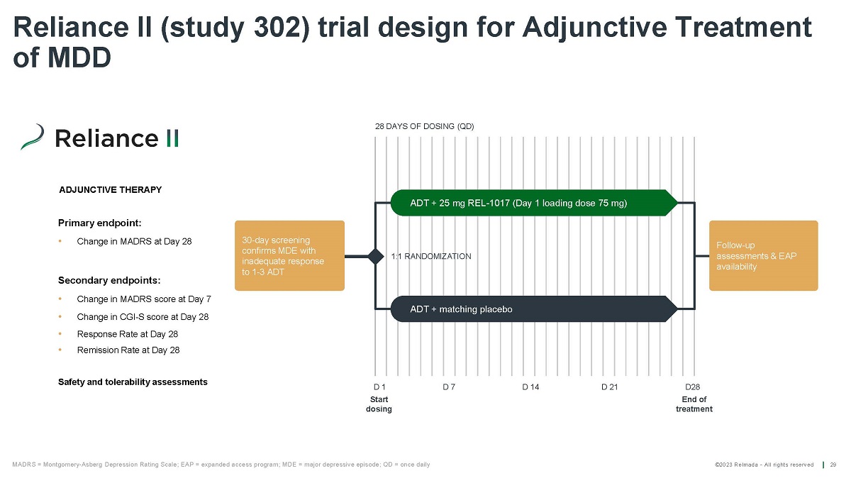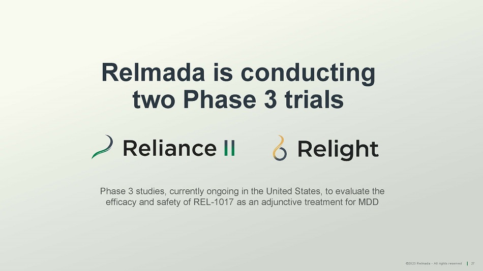 ©2023 Relmada - All rights reserved 27 Relmada is conducting two Phase 3 trials Phase 3 studies, currently ongoing in the United States, to evaluate the efficacy and safety of REL - 1017 as an adjunctive treatment for MDD