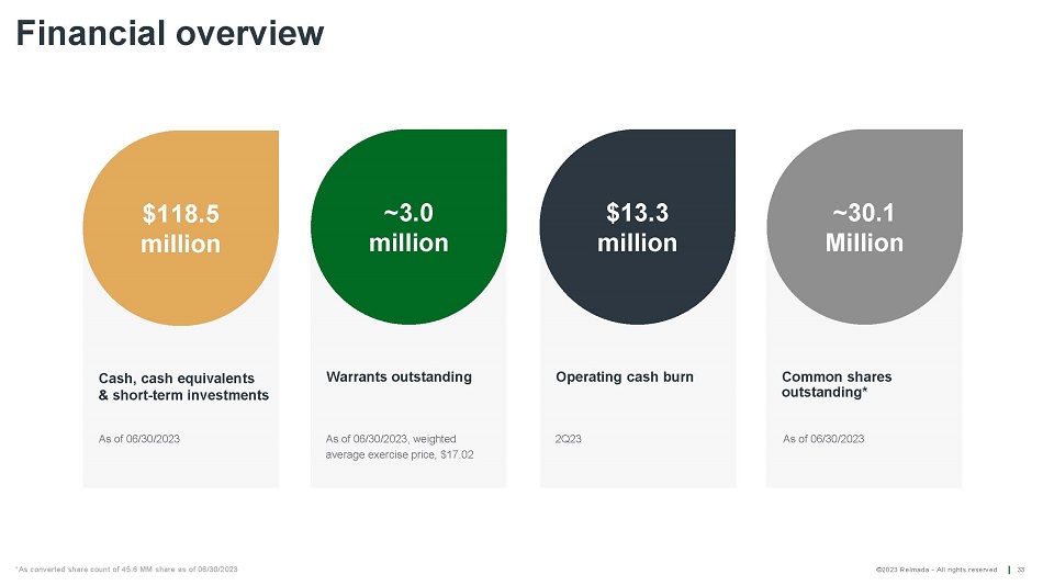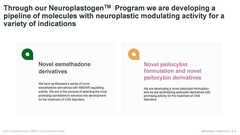 ©2023 Relmada - All rights reserved Warrants outstanding Operating cash burn Common shares outstanding* Financial overview 33 Cash, cash equivalents & short - term investments $118 . 5 m illion ~ 3 .0 m illion $13 . 3 m illion ~ 30 . 1 M illion As of 06/30/2023, weighted average exercise price, $17.02 2 Q 23 As of 06/30/2023 As of 06/30/2023 *As converted share count of 45.6 MM share as of 06/30/2023
