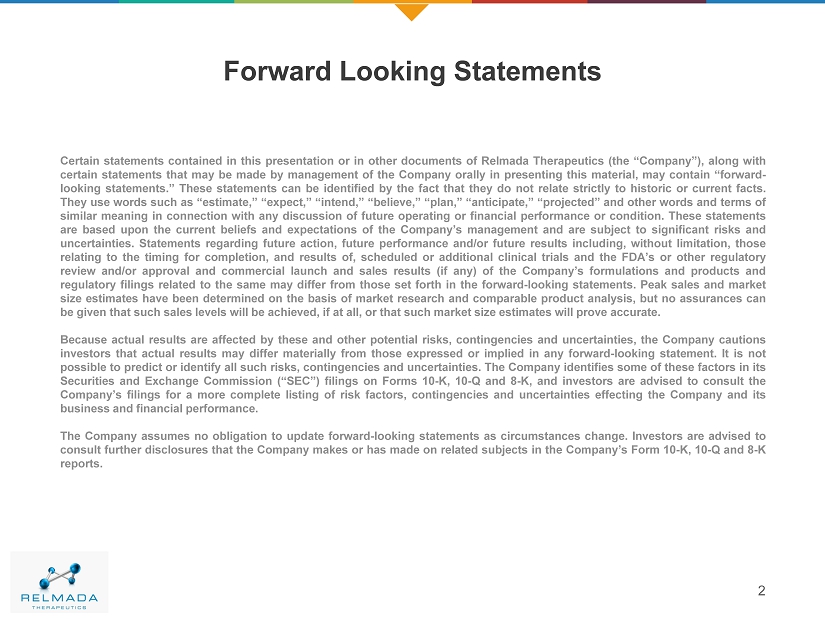 Forward Looking Statements Certain statements contained in this presentation or in other documents of Relmada Therapeutics (the “Company”), along with certain statements that may be made by management of the Company orally in presenting this material, may contain “forward - looking statements . ” These statements can be identified by the fact that they do not relate strictly to historic or current facts . They use words such as “estimate,” “expect,” “intend,” “believe,” “plan,” “anticipate,” “projected” and other words and terms of similar meaning in connection with any discussion of future operating or financial performance or condition . These statements are based upon the current beliefs and expectations of the Company’s management and are subject to significant risks and uncertainties . Statements regarding future action, future performance and/or future results including, without limitation, those relating to the timing for completion, and results of, scheduled or additional clinical trials and the FDA’s or other regulatory review and/or approval and commercial launch and sales results (if any) of the Company’s formulations and products and regulatory filings related to the same may differ from those set forth in the forward - looking statements . Peak sales and market size estimates have been determined on the basis of market research and comparable product analysis, but no assurances can be given that such sales levels will be achieved, if at all, or that such market size estimates will prove accurate . Because actual results are affected by these and other potential risks, contingencies and uncertainties, the Company cautions investors that actual results may differ materially from those expressed or implied in any forward - looking statement . It is not possible to predict or identify all such risks, contingencies and uncertainties . The Company identifies some of these factors in its Securities and Exchange Commission (“SEC”) filings on Forms 10 - K, 10 - Q and 8 - K, and investors are advised to consult the Company’s filings for a more complete listing of risk factors, contingencies and uncertainties effecting the Company and its business and financial performance . The Company assumes no obligation to update forward - looking statements as circumstances change . Investors are advised to consult further disclosures that the Company makes or has made on related subjects in the Company’s Form 10 - K, 10 - Q and 8 - K reports . 2