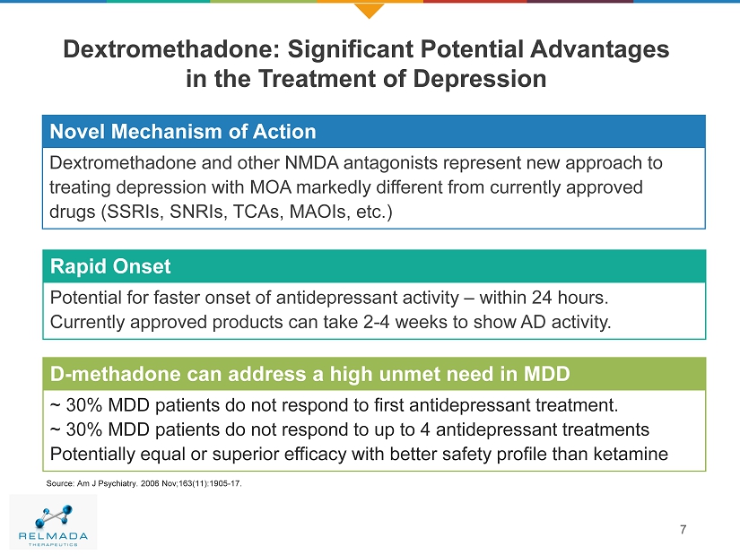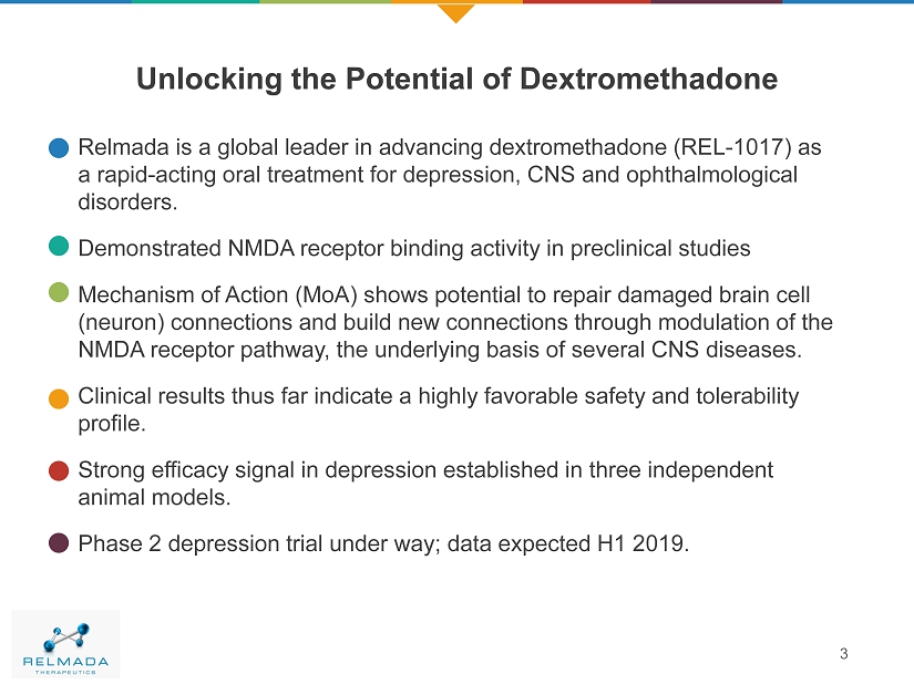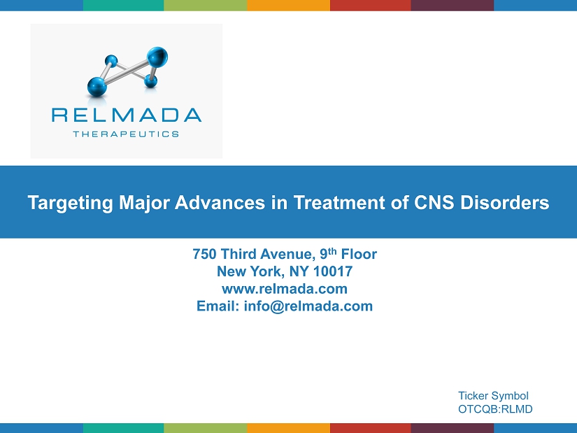 750 Third Avenue, 9 th Floor New York, NY 10017 www.relmada.com Email: info@relmada.com Targeting Major Advances in Treatment of CNS Disorders Ticker Symbol OTCQB:RLMD