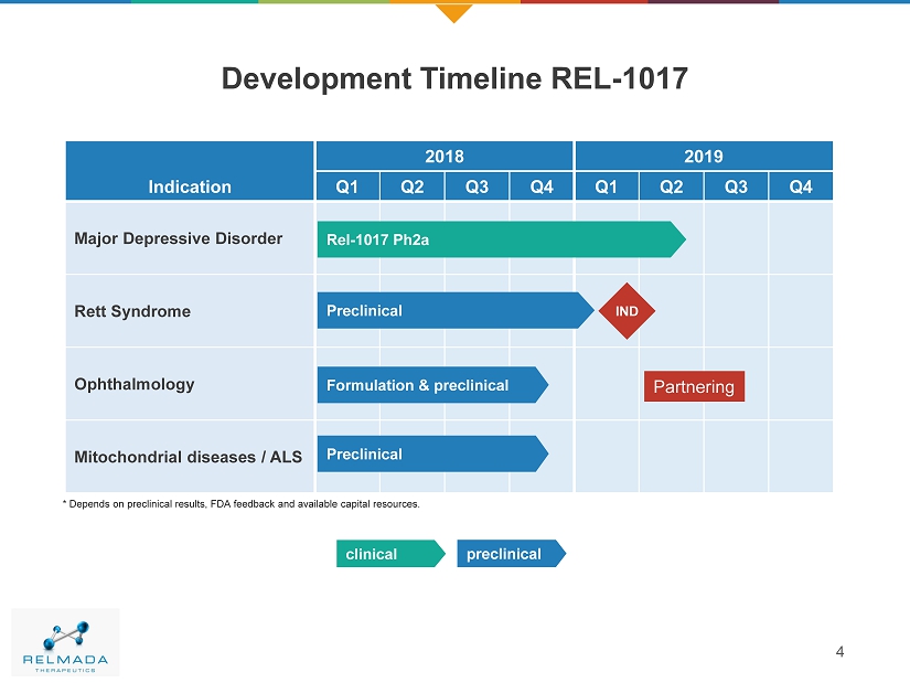 • Relmada is a global leader in advancing dextromethadone (REL - 1017) as a rapid - acting oral treatment for depression, CNS and ophthalmological disorders. • Demonstrated NMDA receptor binding activity in preclinical studies • Mechanism of Action ( MoA ) shows potential to repair damaged brain cell (neuron) connections and build new connections through modulation of the NMDA receptor pathway, the underlying basis of several CNS diseases. • Clinical results thus far indicate a highly favorable safety and tolerability profile. • Strong efficacy signal in depression established in three independent animal models. • Phase 2 depression trial under way; data expected H1 2019. Unlocking the Potential of Dextromethadone 3