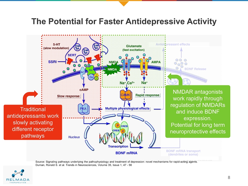 Dextromethadone: Significant Potential Advantages in the Treatment of Depression 7 Source : Am J Psychiatry. 2006 Nov;163(11):1905 - 17. Novel MOA Novel Mechanism of Action Dextromethadone and other NMDA antagonists represent new approach to treating depression with MOA markedly different from currently approved drugs (SSRIs, SNRIs, TCAs, MAOIs, etc.) Rapid Onset Potential for faster onset of antidepressant activity – within 24 hours. Currently approved products can take 2 - 4 weeks to show AD activity. D - methadone can address a high unmet need in MDD ~ 30% MDD patients do not respond to first antidepressant treatment. ~ 30% MDD patients do not respond to up to 4 antidepressant treatments Potentially equal or superior efficacy with better safety profile than ketamine