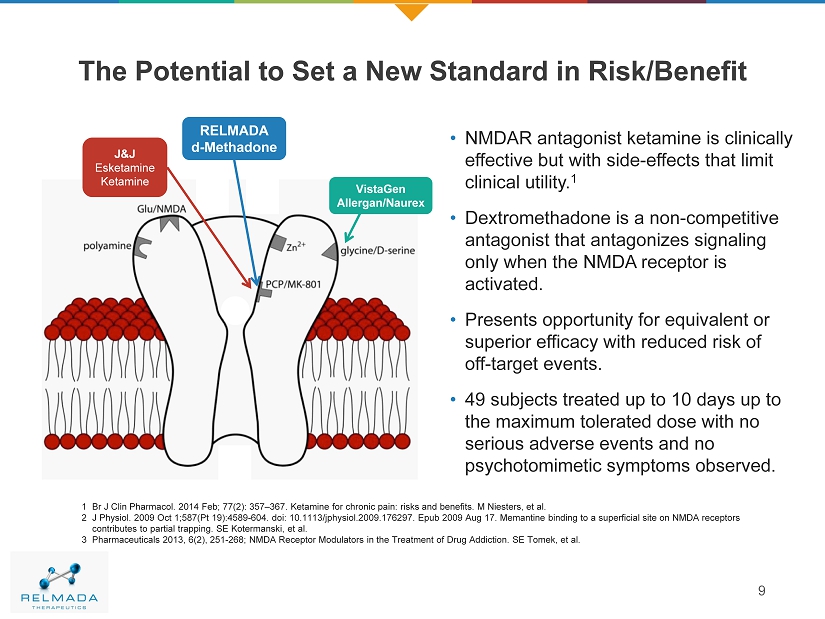 The Potential for Faster Antidepressive Activity 8 Source: Signaling pathways underlying the pathophysiology and treatment of depression: novel mechanisms for rapid - acting agents. Duman, Ronald S. et al. Trends in Neurosciences, Volume 35, Issue 1, 47 - 56 NMDA Traditional antidepressants work slowly activating different receptor pathways NMDAR antagonists work rapidly through regulation of NMDARs and induce BDNF expression. Potential for long term neuroprotective effects