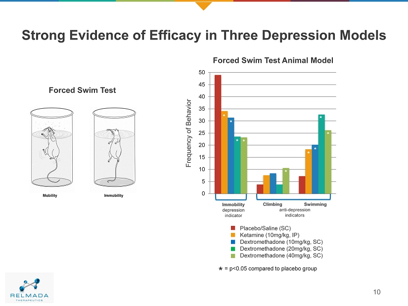 The Potential to Set a New Standard in Risk/Benefit • NMDAR antagonist ketamine is clinically effective but with side - effects that limit clinical utility. 1 • Dextromethadone is a non - competitive antagonist that antagonizes signaling only when the NMDA receptor is activated. • Presents opportunity for equivalent or superior efficacy with reduced risk of off - target events. • 49 subjects treated up to 10 days up to the maximum tolerated dose with no serious adverse events and no psychotomimetic symptoms observed . 1 Br J Clin Pharmacol. 2014 Feb; 77(2): 357 – 367. Ketamine for chronic pain: risks and benefits. M Niesters, et al. 2 J Physiol. 2009 Oct 1;587(Pt 19):4589 - 604. doi: 10.1113/jphysiol.2009.176297. Epub 2009 Aug 17. Memantine binding to a superfi cial site on NMDA receptors contributes to partial trapping. SE Kotermanski, et al. 3 Pharmaceuticals 2013, 6(2), 251 - 268; NMDA Receptor Modulators in the Treatment of Drug Addiction. SE Tomek, et al. VistaGen Allergan/Naurex RELMADA d - Methadone J&J Esketamine Ketamine 9