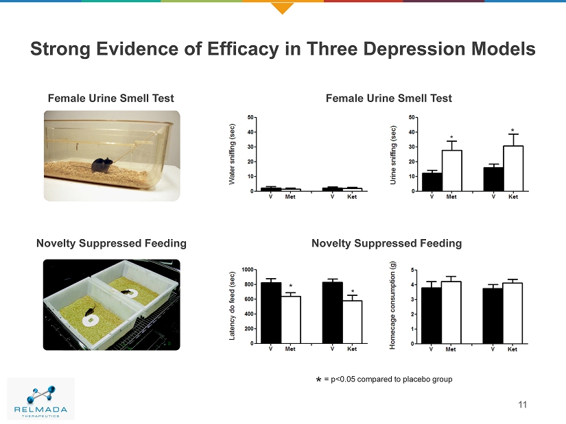 Novelty Suppressed Feeding * * Strong Evidence of Efficacy in Three Depression Models 11 * Female Urine Smell Test * Female Urine Smell Test Novelty Suppressed Feeding = p<0.05 compared to placebo group *