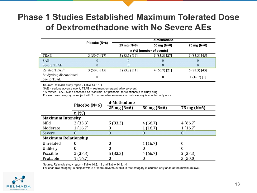 Phase 1 Studies Established Maximum Tolerated Dose of Dextromethadone with No Severe AEs 12 Single Ascending Dose (SAD) Study Design • Parallel group, double - blind, placebo controlled Objectives : • Establish PK, PD and safety of single dose administration Treatment Administration: • Cohorts 5, 20, 60, 100, 150, 200 mg • N = 42 Study Conclusions: • MTD = 150 mg (single dose) • PK demonstrated linear proportionality of C max and AUC 0 - inf vs. dose • No clinically significant opioid effects of dextromethadone up to 150 mg Multiple Ascending Dose (MAD) Study Design • Parallel group, double - blind, placebo controlled Objectives: • Establish PK, PD and safety of once daily, 10 day administration Treatment Administration: • Cohorts 25, 50, 75 mg • N = 24 Study Conclusions: • Doses up to 75mg per day well tolerated • Dose proportionality was demonstrated for the single - dose parameters C max and AUC tau on Day 1 and for the steady - state parameters C max , AUC tau , and C ss on Day 10 12