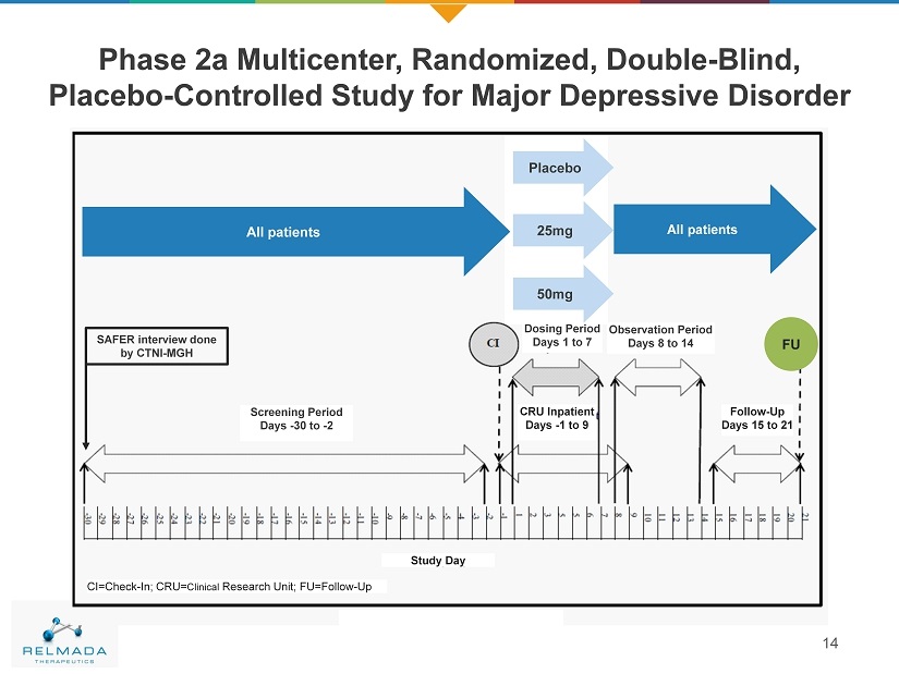 Phase 2a Multicenter, Randomized, Double - Blind, Placebo - Controlled Study for Major Depressive Disorder 14 SAFER interview done by CTNI - MGH Screening Period Days - 30 to - 2 Dosing Period Days 1 to 7 Observation Period Days 8 to 14 Follow - Up Days 15 to 21 CRU Inpatient Days - 1 to 9 All Patients All Patients Study Day CI=Check - In; CRU= Clinical Research Unit; FU=Follow - Up FU Placebo 25mg 50mg All patients All patients