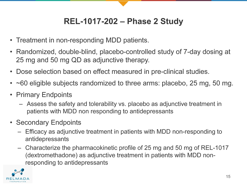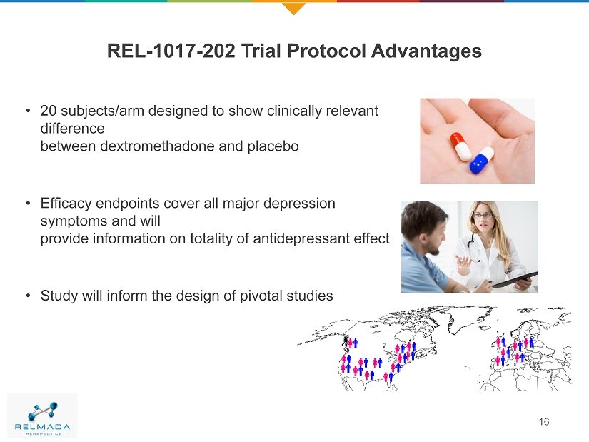 • Treatment in non - responding MDD patients. • Randomized, double - blind, placebo - controlled study of 7 - day dosing at 25 mg and 50 mg QD as adjunctive therapy. • Dose selection based on effect measured in pre - clinical studies. • ~60 eligible subjects randomized to three arms: placebo, 25 mg, 50 mg. • Primary Endpoints – Assess the safety and tolerability vs. placebo as adjunctive treatment in patients with MDD non responding to antidepressants • Secondary Endpoints – Efficacy as adjunctive treatment in patients with MDD non - responding to antidepressants – Characterize the pharmacokinetic profile of 25 mg and 50 mg of REL - 1017 (dextromethadone) as adjunctive treatment in patients with MDD non - responding to antidepressants REL - 1017 - 202 – Phase 2 Study 15