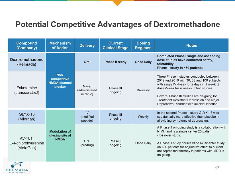 Potential Competitive Advantages of Dextromethadone 17 Compound (Company) Mechanism of Action Delivery Current Clinical Stage Dosing Regimen Notes Dextromethadone (Relmada) Non - competitive NMDA channel blocker Oral Phase II ready Once Daily Completed Phase I single and ascending dose studies have confirmed safety, tolerability Phase II study in ~60 patients. Esketamine (Janssen/J&J) Nasal (administered in clinic) Phase III ongoing Biweekly Three Phase II studies conducted between 2012 and 2016 with 30, 68 and 108 subjects with single IV doses for 2 days in 1 week, 2 doses/week for 4 weeks in two studies . Several Phase III studies are on - going for Treatment Resistant Depression and Major Depressive Disorder with suicidal ideation GLYX - 13 (Allergan) Modulation of glycine site of NMDA IV (modified peptide) Phase III ongoing Weekly In the second Phase II study GLYX - 13 was substantially more effective than placebo in alleviating symptoms of depression. AV - 101, L - 4 - chlorokyurenine ( VistaGen ) Oral (prodrug) Phase II ongoing Once Daily A Phase II on - going study is a collaboration with NIMH and is a single center 25 patient crossover study . A Phase II study double blind multicenter study on 180 patients for adjunctive effect to current antidepressant therapy in patients with MDD is on - going.