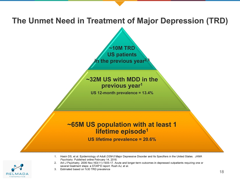 The Unmet Need in Treatment of Major Depression (TRD) 18 ~10M TRD US patients in the previous year 2,3 ~32M US with MDD in the previous year 1 US 12 - month prevalence = 13.4% ~65M US population with at least 1 lifetime episode 1 US lifetime prevalence = 20.6% 1. Hasin DS, et al. Epidemiology of Adult DSM - 5 Major Depressive Disorder and Its Specifiers in the United States. JAMA Psychiatry. Published online February 14, 2018. 2. Am J Psychiatry. 2006 Nov;163(11):1905 - 17. Acute and longer - term outcomes in depressed outpatients requiring one or several treatment steps: a STAR*D report. Rush AJ, et al . 3. Estimated based on %30 TRD prevalence