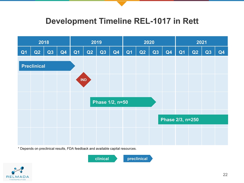 • Studies of ketamine in Rett Syndrome mouse models show that: – Low - dose ketamine acutely reverses multiple disease manifestations – Chronic administration of ketamine improves Rett Syndrome progression • Mecp2 mouse models recapitulate salient clinical manifestations allowing for translatability of pre - clinical findings. • Dr. Michela Fagiolini at Harvard Medical School and Boston Children’s Hospital conducting acute and chronic studies in Mecp2 +/ - female mice. • Relmada toxicology studies in juvenile animals proceeding in parallel. • Fast development path – Potential for entry directly into Phase 2 in 2019 NMDARs Have Shown Potential Efficacy in Treatment of Rett Syndrome 21