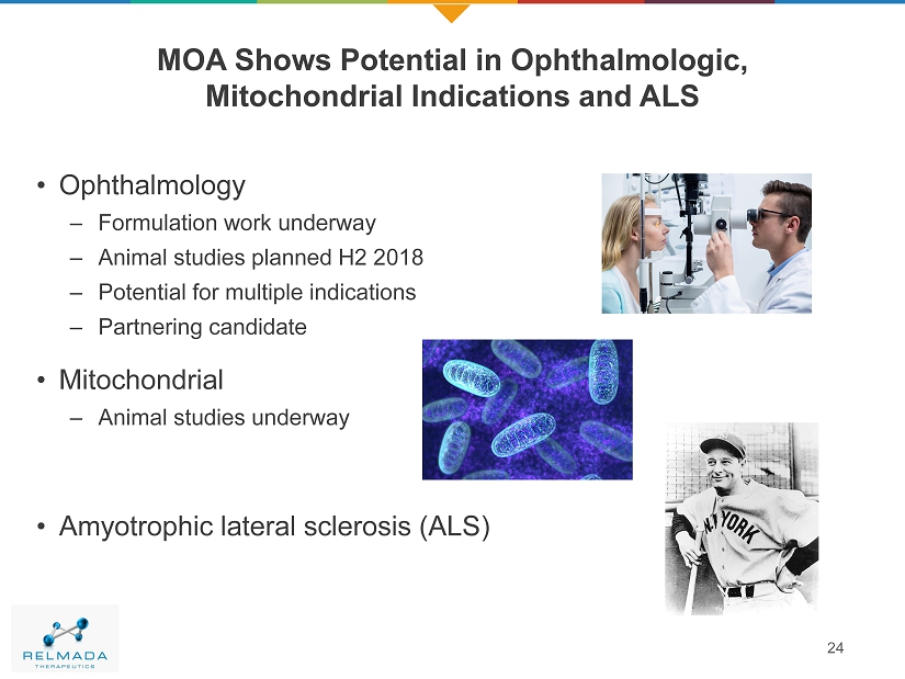 • Ophthalmology – Formulation work underway – Animal studies planned H2 2018 – Potential for multiple indications – Partnering candidate • Mitochondrial – Animal studies underway • Amyotrophic lateral sclerosis (ALS) MOA Shows Potential in Ophthalmologic, Mitochondrial Indications and ALS 24