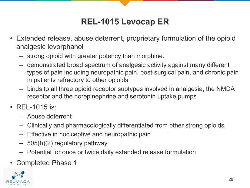 • Extended release, abuse deterrent, proprietary formulation of the opioid analgesic levorphanol – strong opioid with greater potency than morphine. – demonstrated broad spectrum of analgesic activity against many different types of pain including neuropathic pain, post - surgical pain, and chronic pain in patients refractory to other opioids – binds to all three opioid receptor subtypes involved in analgesia, the NMDA receptor and the norepinephrine and serotonin uptake pumps • REL - 1015 is: – Abuse deterrent – Clinically and pharmacologically differentiated from other strong opioids – Effective in nociceptive and neuropathic pain – 505(b)(2) regulatory pathway – Potential for once or twice daily extended release formulation • Completed Phase 1 REL - 1015 Levocap ER 26