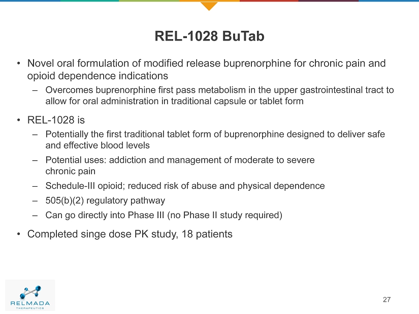 • Novel oral formulation of modified release buprenorphine for chronic pain and opioid dependence indications – Overcomes buprenorphine first pass metabolism in the upper gastrointestinal tract to allow for oral administration in traditional capsule or tablet form • REL - 1028 is – Potentially the first traditional tablet form of buprenorphine designed to deliver safe and effective blood levels – Potential uses: addiction and management of moderate to severe chronic pain – Schedule - III opioid; reduced risk of abuse and physical dependence – 505(b)(2) regulatory pathway – Can go directly into Phase III (no Phase II study required) • Completed singe dose PK study, 18 patients REL - 1028 BuTab 27