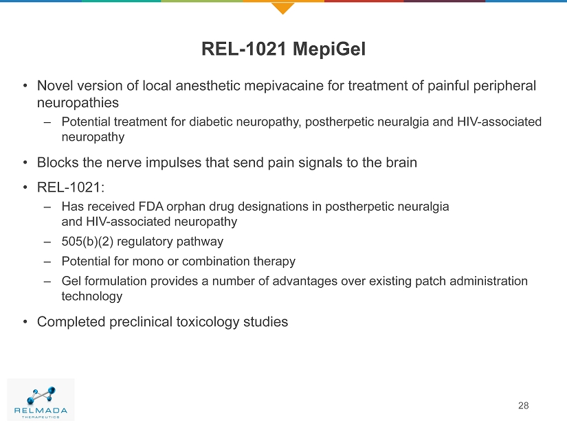• Novel version of local anesthetic mepivacaine for treatment of painful peripheral neuropathies – Potential treatment for diabetic neuropathy, postherpetic neuralgia and HIV - associated neuropathy • Blocks the nerve impulses that send pain signals to the brain • REL - 1021: – Has received FDA orphan drug designations in postherpetic neuralgia and HIV - associated neuropathy – 505(b)(2) regulatory pathway – Potential for mono or combination therapy – Gel formulation provides a number of advantages over existing patch administration technology • Completed preclinical toxicology studies REL - 1021 MepiGel 28