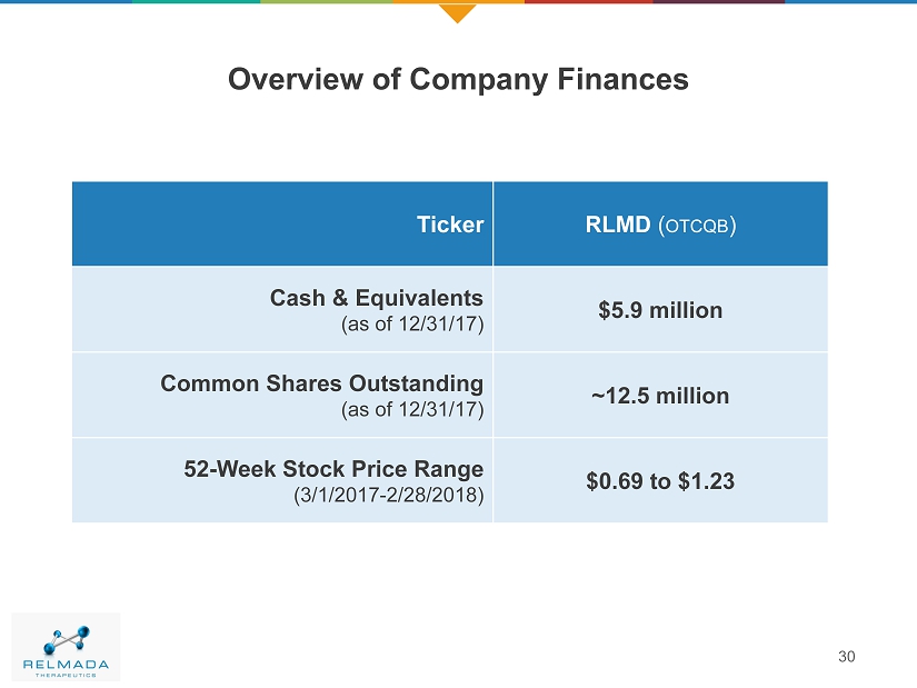 Overview of Company Finances Ticker RLMD ( OTCQB ) Cash & Equivalents (as of 12/31/17) $5.9 million Common Shares Outstanding (as of 12/31/17) ~12.5 million 52 - Week Stock Price Range (3/1/2017 - 2/28/2018) $0.69 to $1.23 30