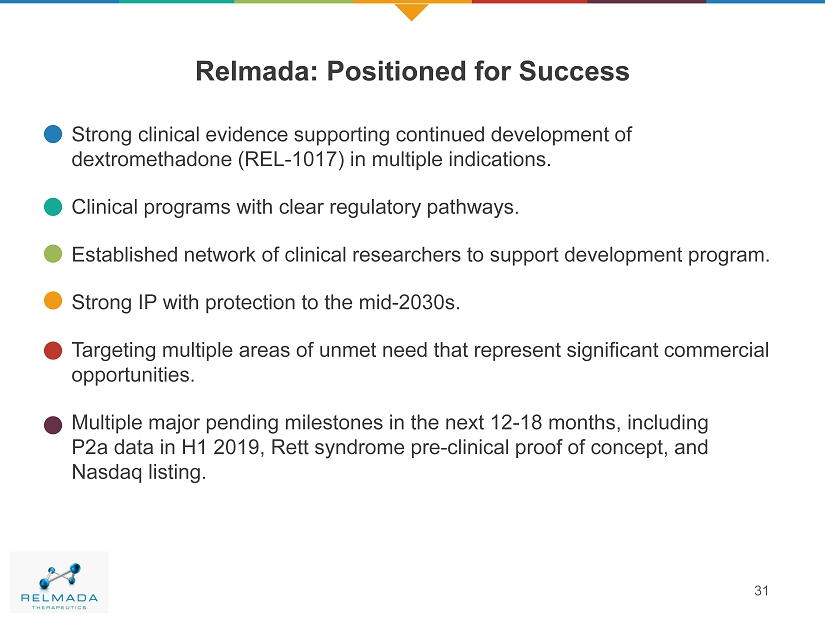 • Strong clinical evidence supporting continued development of dextromethadone (REL - 1017) in multiple indications. • Clinical programs with clear regulatory pathways. • Established network of clinical researchers to support development program. • Strong IP with protection to the mid - 2030s. • Targeting multiple areas of unmet need that represent significant commercial opportunities. • Multiple major pending milestones in the next 12 - 18 months, including P2a data in H1 2019, Rett syndrome pre - clinical proof of concept, and Nasdaq listing. Relmada: Positioned for Success 31