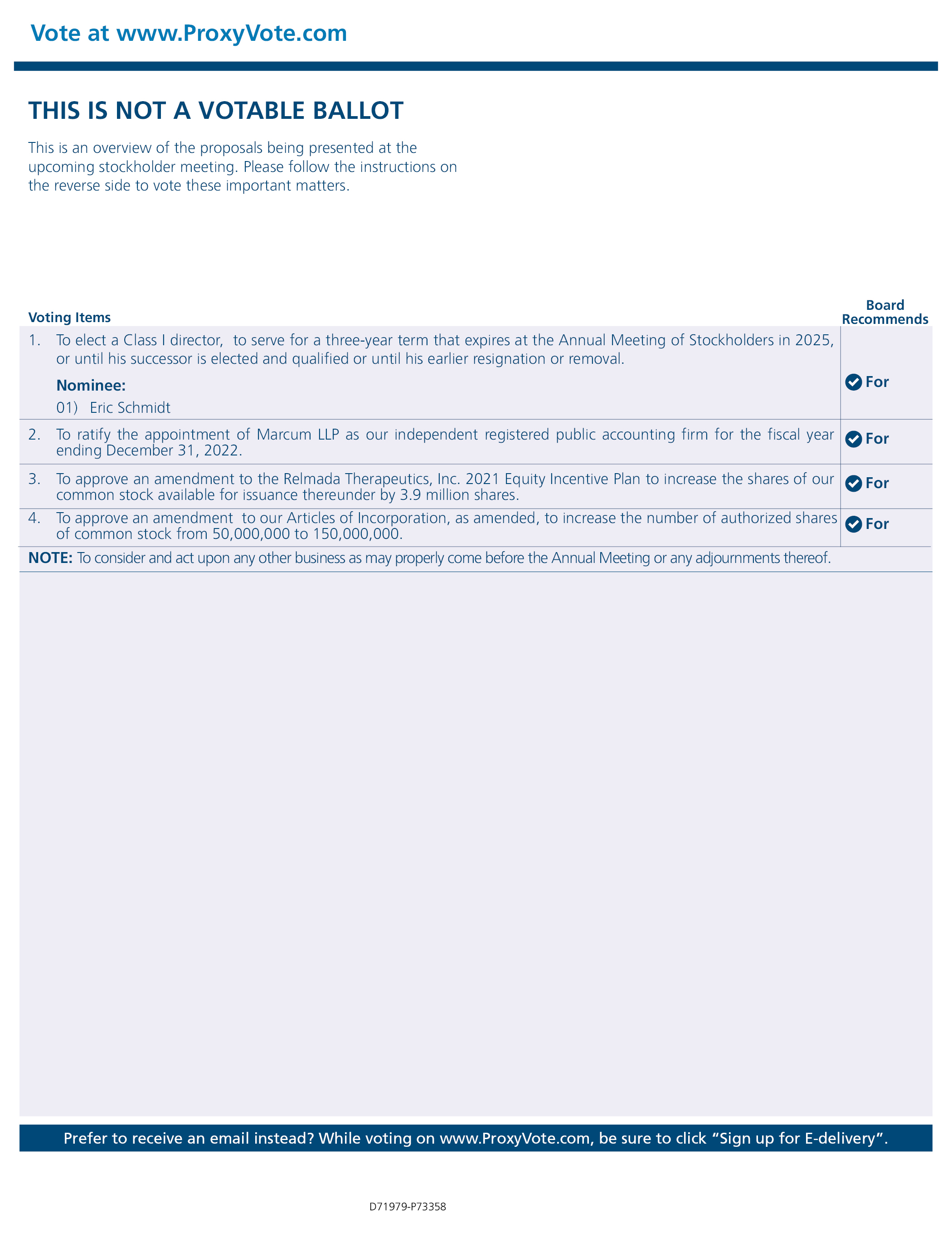 Vote at www.ProxyVote.com THIS IS NOT A VOTABLE BALLOT This is an overview of the proposals being presented at the upcoming stockholder meeting. Please follow the instructions on the reverse side to vote these important matters. Voting Items Board Recommends 1. To elect a Class I director, to serve for a three-year term that expires at the Annual Meeting of Stockholders in 2025, or until his successor is elected and qualified or until his earlier resignation or removal. Nominee: 01) Eric Schmidt For 2. To ratify the appointment of Marcum LLP as our independent registered public accounting firm for the fiscal year ending December 31, 2022. For 3. To approve an amendment to the Relmada Therapeutics, Inc. 2021 Equity Incentive Plan to increase the shares of our common stock available for issuance thereunder by 3.9 million shares. For 4. To approve an amendment to our Articles of Incorporation, as amended, to increase the number of authorized shares of common stock from 50,000,000 to 150,000,000. For NOTE: To consider and act upon any other business as may properly come before the Annual Meeting or any adjournments thereof. Prefer to receive an email instead? While voting on www.ProxyVote.com, be sure to click “Sign up for E-delivery”. D71979-P73358