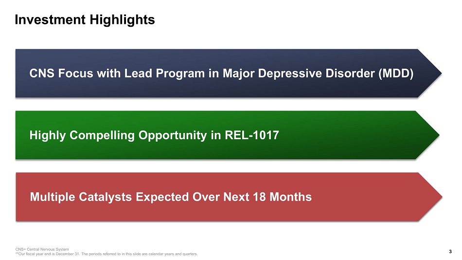Investment Highlights Highly Compelling Opportunity in REL - 1017 Multiple Catalysts Expected Over Next 18 Months CNS Focus with Lead Program in Major Depressive Disorder (MDD) CNS= Central Nervous System **Our fiscal year end is December 31. The periods referred to in this slide are calendar years and quarters. 3
