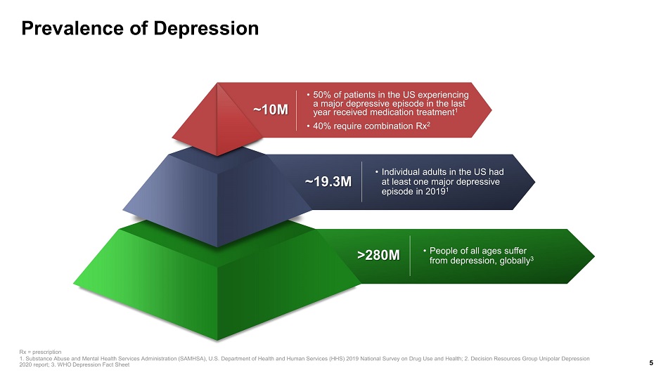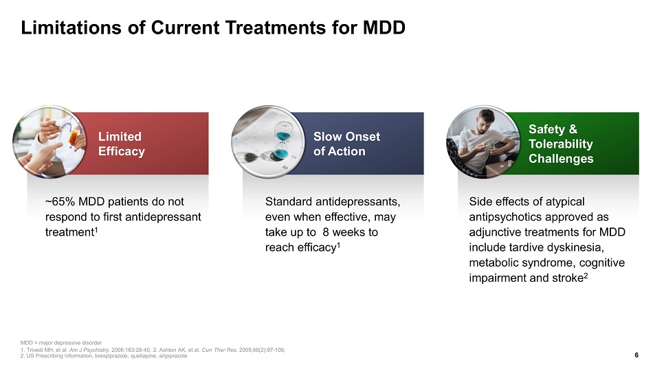 Prevalence of Depression ~10M • 50% of patients in the US experiencing a major depressive episode in the last year received medication treatment 1 • 40% require combination Rx 2 ~19.3M • Individual adults in the US had at least one major depressive episode in 2019 1 >280M from depression, globally • People of all ages suffer 3 5 Rx = prescription 1. Substance Abuse and Mental Health Services Administration (SAMHSA), U.S. Department of Health and Human Services (HHS) 2019 National Survey on Drug Use and Health; 2. Decision Resources Group Unipolar Depression 2020 report; 3. WHO Depression Fact Sheet