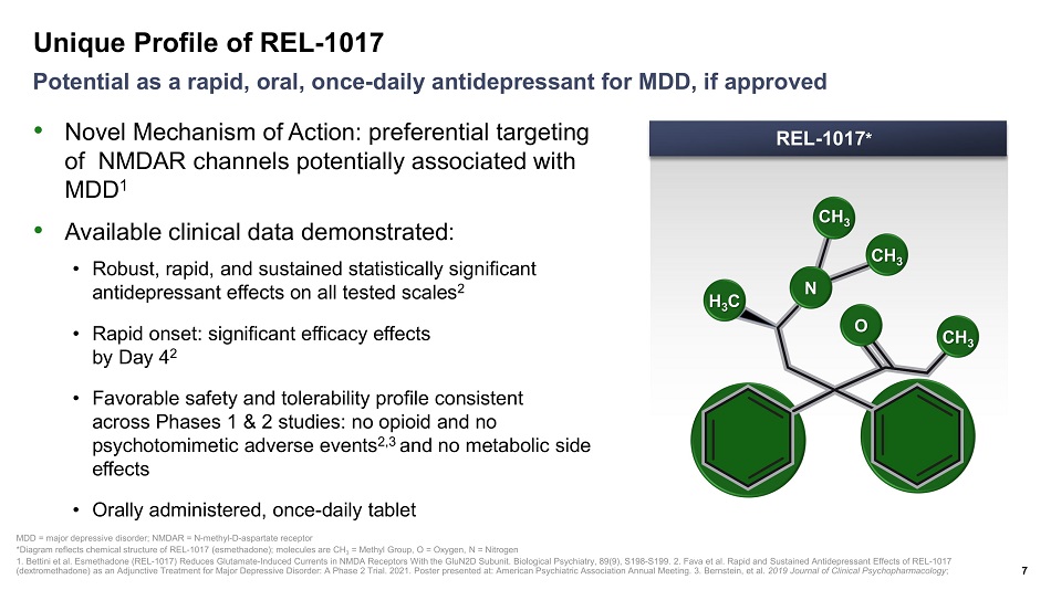 Unique Profile of REL - 1017 7 Potential as a rapid, oral, once - daily antidepressant for MDD, if approved REL - 1017 * CH 3 CH 3 CH 3 O N 3 H C • Orally administered, once - daily tablet MDD = major depressive disorder; NMDAR = N - methyl - D - aspartate receptor *Diagram reflects chemical structure of REL - 1017 (esmethadone); molecules are CH 3 = Methyl Group, O = Oxygen, N = Nitrogen 1. Bettini et al. Esmethadone (REL - 1017) Reduces Glutamate - Induced Currents in NMDA Receptors With the GluN2D Subunit. Biological Psychiatry, 89(9), S198 - S199. 2. Fava et al. Rapid and Sustained Antidepressant Effects of REL - 1017 (dextromethadone) as an Adjunctive Treatment for Major Depressive Disorder: A Phase 2 Trial. 2021. Poster presented at: American Psychiatric Association Annual Meeting. 3. Bernstein, et al. 2019 Journal of Clinical Psychopharmacology ; • Novel Mechanism of Action: preferential targeting of NMDAR channels potentially associated with MDD 1 • Available clinical data demonstrated: • Robust, rapid, and sustained statistically significant antidepressant effects on all tested scales 2 • Rapid onset: significant efficacy effects by Day 4 2 • Favorable safety and tolerability profile consistent across Phases 1 & 2 studies: no opioid and no psychotomimetic adverse events 2,3 and no metabolic side effects