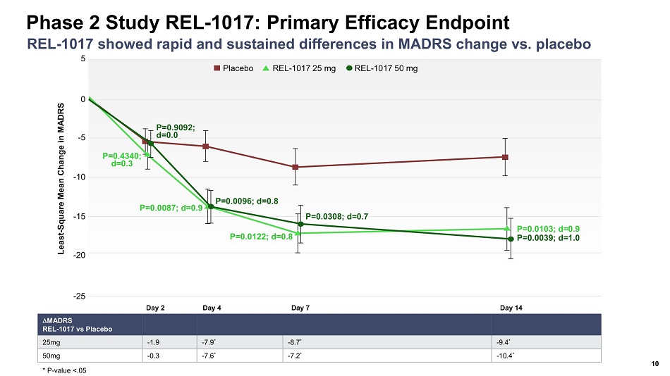 Phase 1 SAD & MAD Studies for REL - 1017, Data Published 2019 PK = pharmacokinetics; PD = pharmacodynamics; MTD: =maximum tolerated dose; C max = maximum plasma concentration ; AUC 0 - inf = area under the curve 0 to infinite time; AUC t = area under the curve to the end of dosing period; N = number of patients; NMDA = N - methyl - D - aspartate receptor antagonist; AESI = adverse event of special interest Source: Bernstein, G. et al., J. Clin. Psychopharmacology 2019 May/Jun; 39(3):226 - 237. Multiple Ascending Dose (MAD) Study Design Parallel group, double - blind, placebo controlled Single Ascending Dose (SAD) Study Design Parallel group, double - blind, placebo controlled Objectives Establish PK, PD, and safety of single dose administration Treatment Administration • 6 Cohorts: 5, 20, 60, 100, 150, 200 mg • N = 42 Objectives Establish PK, PD, and safety of once daily, 10 - day administration Treatment Administration • 3 Cohorts: 25, 50, 75 mg • N = 24 Study Conclusions • Maximum Tolerated Dose (MTD) = 150 mg • PK demonstrated linear proportionality of C max , AUC 0 - inf vs. dose • No clinically significant opioid or NMDA AESI signal Study Conclusions • The highest dose studied, 75mg daily, was well tolerated • Favorable safety and tolerability profile • No clinically significant opioid or NMDA AESI signal 9