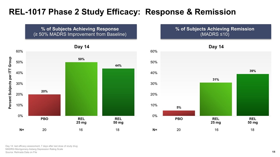 Phase 2 Study REL - 1017: Primary Efficacy Endpoint 10 REL - 1017 showed rapid and sustained differences in MADRS change vs. placebo Day 2 Day 4 Day 7 Day 14 5 0 - 5 - 25 Least - Square Mean Change in MADRS - 15 - 20 P=0.0103; d=0.9 P=0.0039; d=1.0 P=0.0308; d=0.7 P=0.0122; d=0.8 P=0.0096; d=0.8 P=0.0087; d=0.9 P=0.9092; d=0.0 P=0.4340; d=0.3 - 10 Placebo REL - 1017 25 mg REL - 1017 50 mg MADRS REL - 1017 vs Placebo 25mg - 1.9 - 7.9 * - 8.7 * - 9.4 * 50mg - 0.3 - 7.6 * - 7.2 * - 10.4 * * P - value <.05