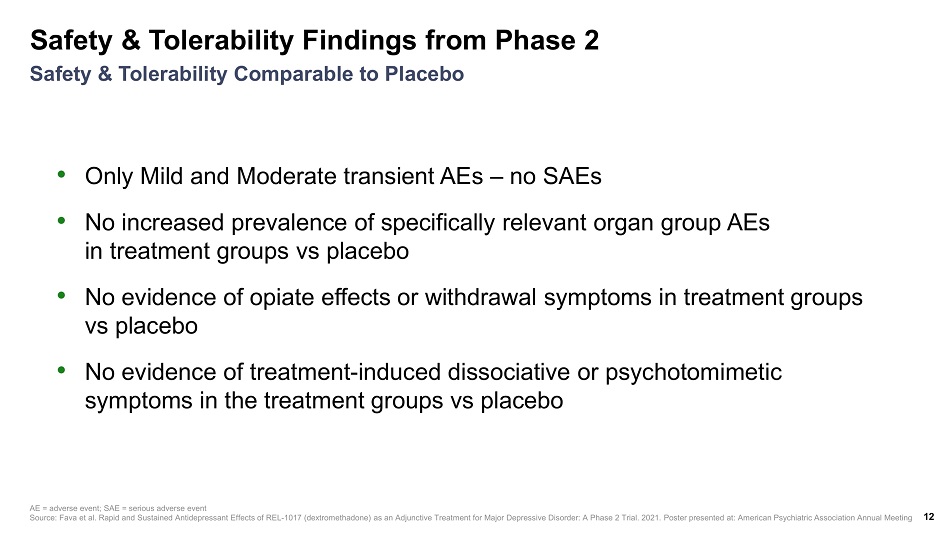 REL - 1017 Phase 2 Study Efficacy: Response & Remission % of Subjects Achieving Remission (MADRS ≤10) Percent Subjects per ITT Group % of Subjects Achieving Response (≥ 50% MADRS Improvement from Baseline) 11 Day 14: last efficacy assessment, 7 days after last dose of study drug MADRS=Montgomery - Asberg Depression Rating Scale Source: Relmada Data on File Day 14 20% 50% 44% 0% 10% 20% 30% 40% 50% 60% Day 14 5% 31% 39% 0% PBO REL REL PBO REL REL N= 20 25 mg 16 50 mg 18 N= 20 25 mg 16 50 mg 18 10% 20% 30% 40% 50% 60%
