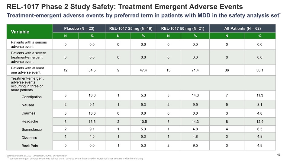 Safety & Tolerability Findings from Phase 2 Safety & Tolerability Comparable to Placebo • Only Mild and Moderate transient AEs – no SAEs • No increased prevalence of specifically relevant organ group AEs in treatment groups vs placebo • No evidence of opiate effects or withdrawal symptoms in treatment groups vs placebo • No evidence of treatment - induced dissociative or psychotomimetic symptoms in the treatment groups vs placebo 12 AE = adverse event; SAE = serious adverse event Source: Fava et al. Rapid and Sustained Antidepressant Effects of REL - 1017 (dextromethadone) as an Adjunctive Treatment for Major Depressive Disorder: A Phase 2 Trial. 2021. Poster presented at: American Psychiatric Association Annual Meeting