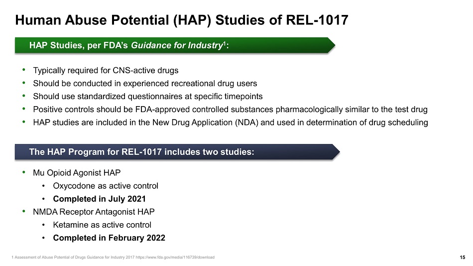 Human Abuse Potential (HAP) Studies of REL - 1017 15 HAP Studies, per FDA’s Guidance for Industry 1 : The HAP Program for REL - 1017 includes two studies: • Mu Opioid Agonist HAP • Oxycodone as active control • Completed in July 2021 • NMDA Receptor Antagonist HAP • Ketamine as active control • Completed in February 2022 1 Assessment of Abuse Potential of Drugs Guidance for Industry 2017 https:// www.fda.gov/media/116739/download • Typically required for CNS - active drugs • Should be conducted in experienced recreational drug users • Should use standardized questionnaires at specific timepoints • Positive controls should be FDA - approved controlled substances pharmacologically similar to the test drug • HAP studies are included in the New Drug Application (NDA) and used in determination of drug scheduling