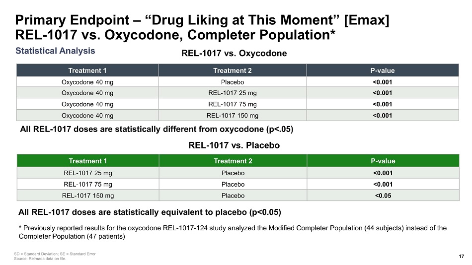 Primary Endpoint – “Drug Liking at This Moment” [Emax] REL - 1017 vs. Oxycodone, Completer Population* Statistic Parameter Placebo REL - 1017 25 mg REL - 1017 75 mg REL - 1017 150 mg Oxycodone 40 mg n 47 47 47 47 47 Mean 52.7 54.2 58.7 64.9 83.2 Median 50 50 50 58 85 SD 6.52 10.35 15.82 16.58 16.57 SE 0.95 1.51 2.31 2.42 2.42 SD = Standard Deviation; SE = Standard Error Source: Relmada data on file. Consistent results were seen for the secondary endpoints * Previously reported results for the oxycodone REL - 1017 - 124 study analyzed the Modified Completer Population (44 subjects) instead of the Completer Population (47 patients) 16